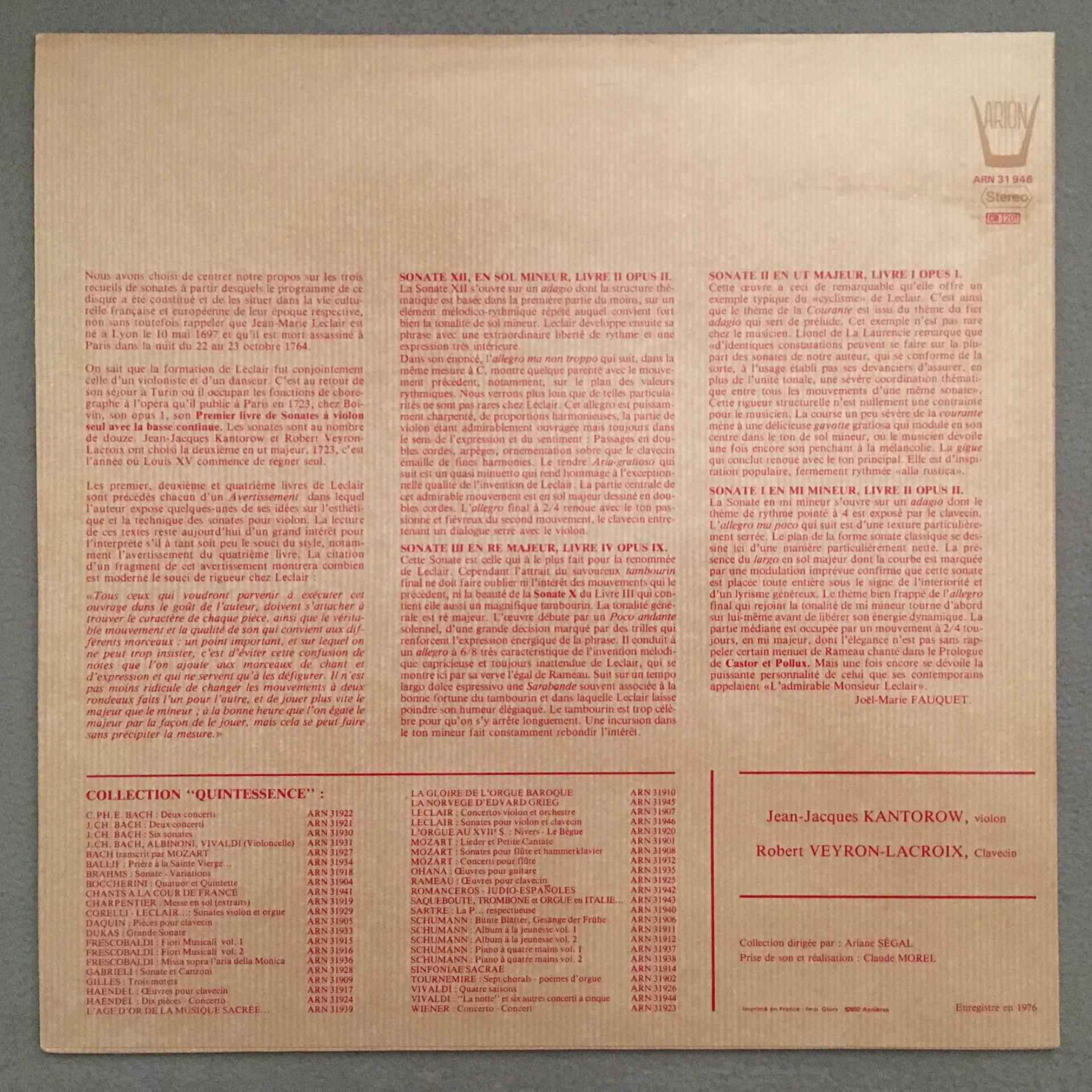 K540 Leclair Violin & Piano Sonatas Kantorow Vayron-Lacroix Arion ARN 31 946 St