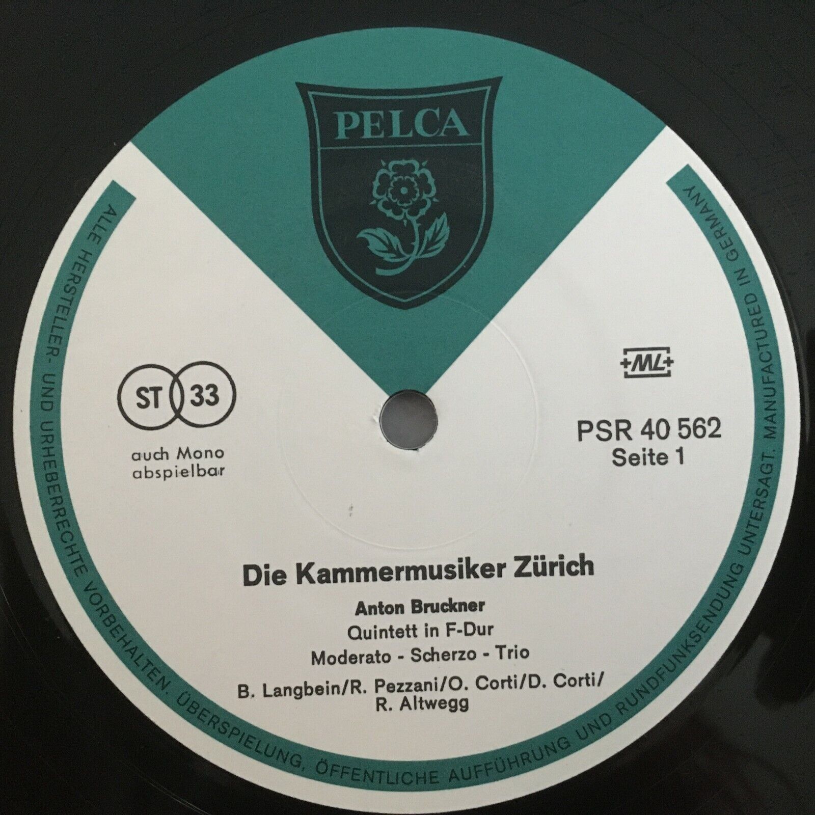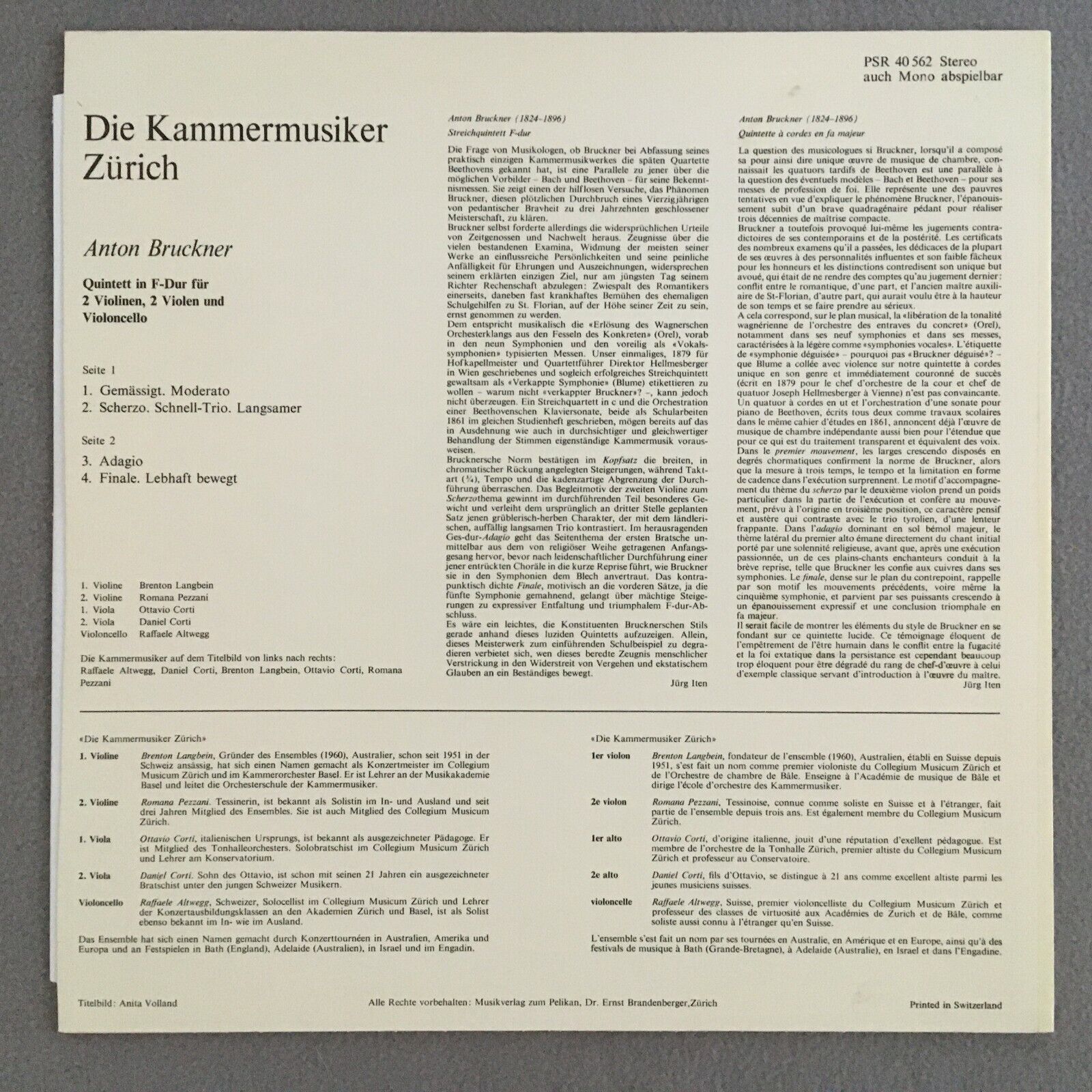 R852 Bruckner Quintet Chamber Music Zürich Pelca PSR 40 562 Stereo