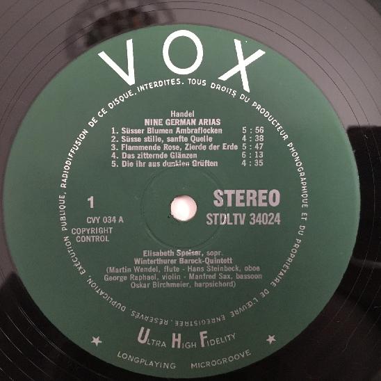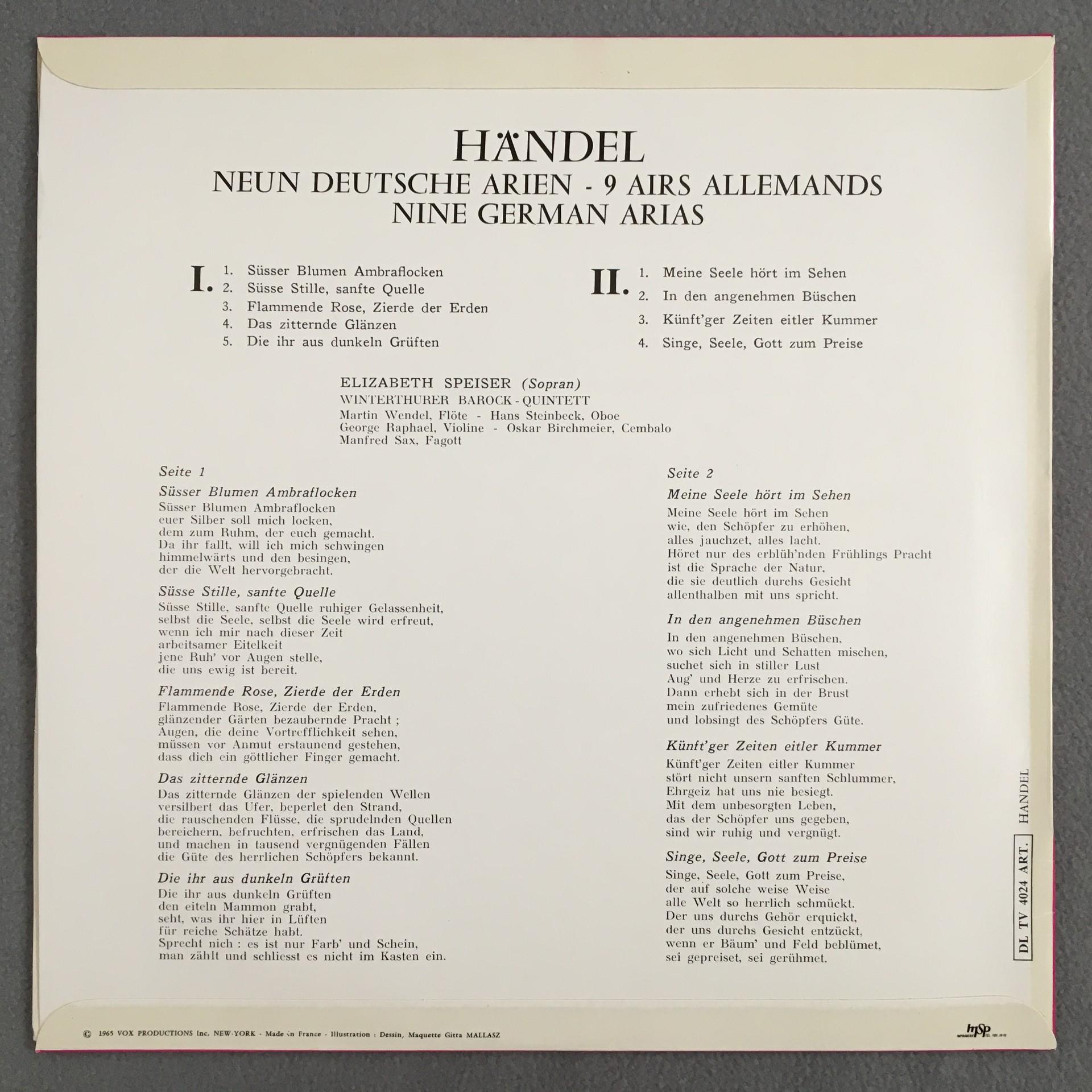 K788 Handel 9 German Arias Speiser Winterthur Quintet VOX TV 34024S Stereo