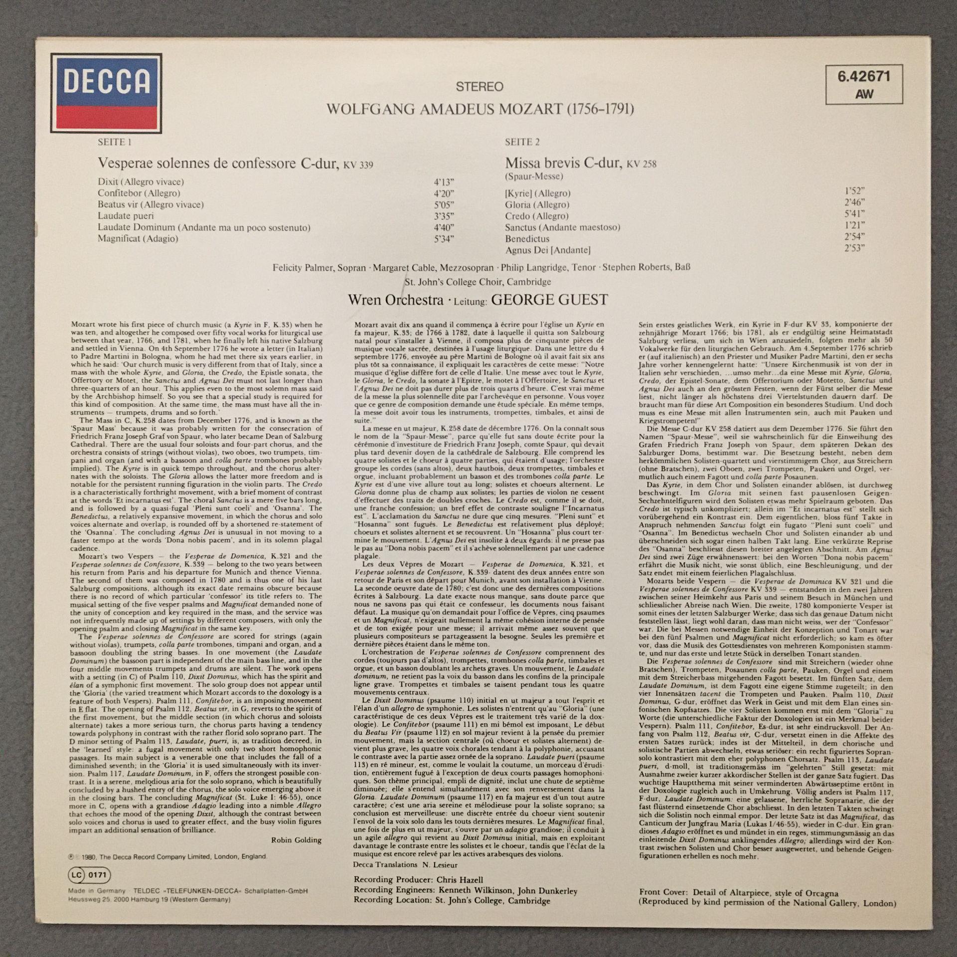 K894 Mozart Missa Brevis Palmer Cable Langridge Guest DECCA 6.42671 AW Stereo
