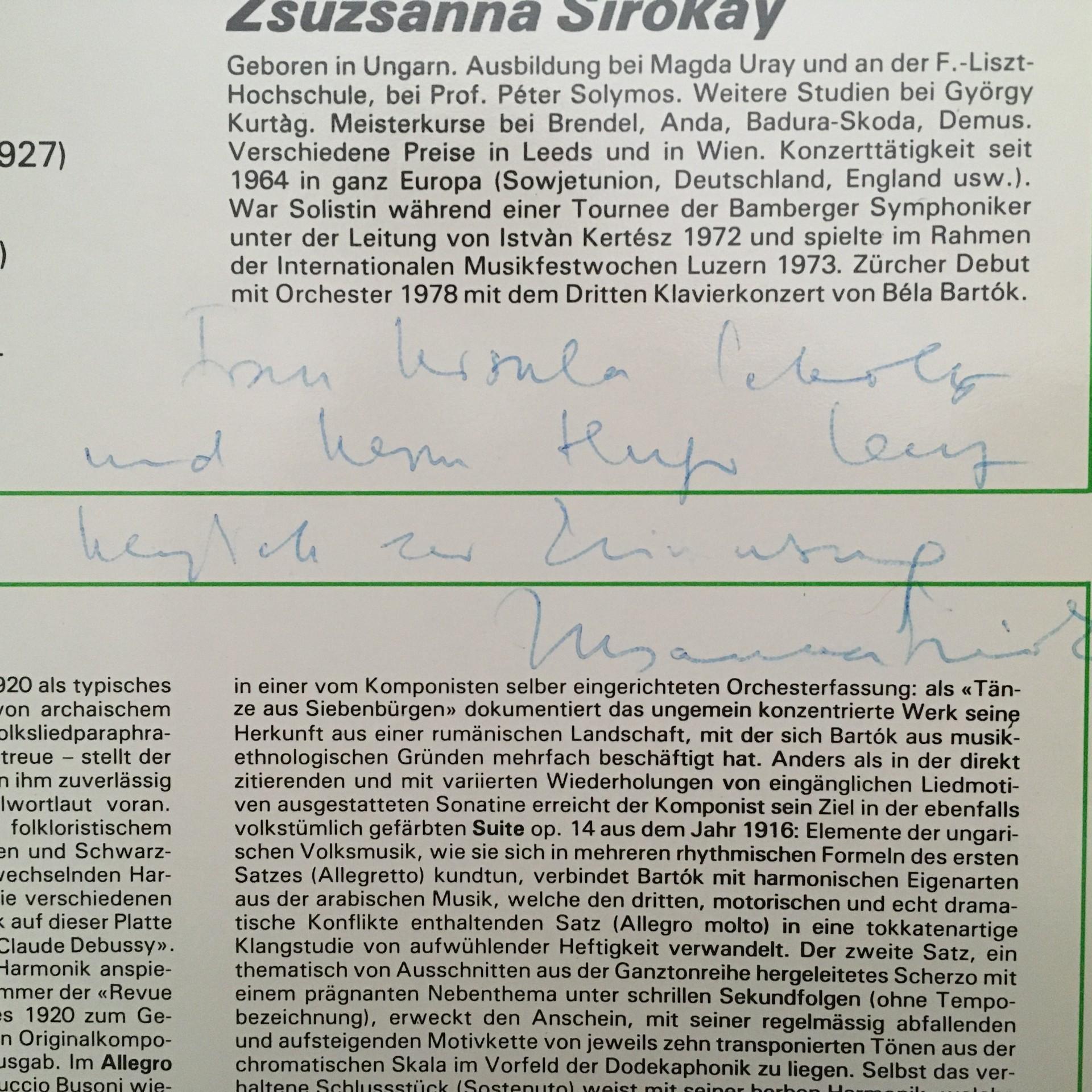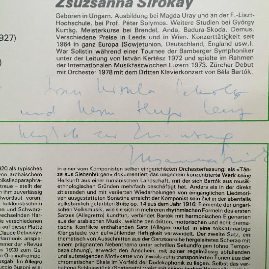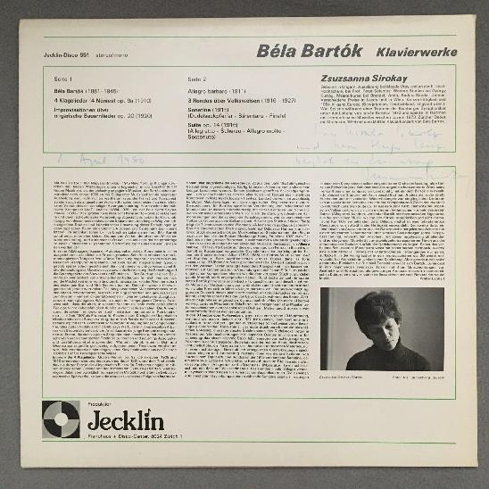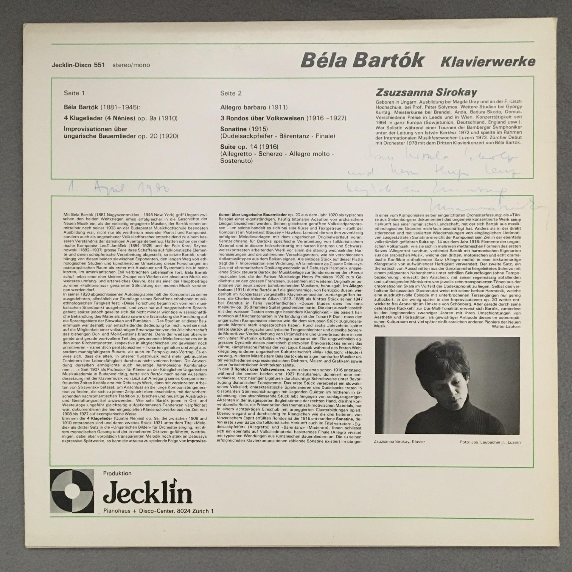 K992 Bartok Piano Works Zsuzsanna Sirokay Jecklin 551 Stereo SIGNED