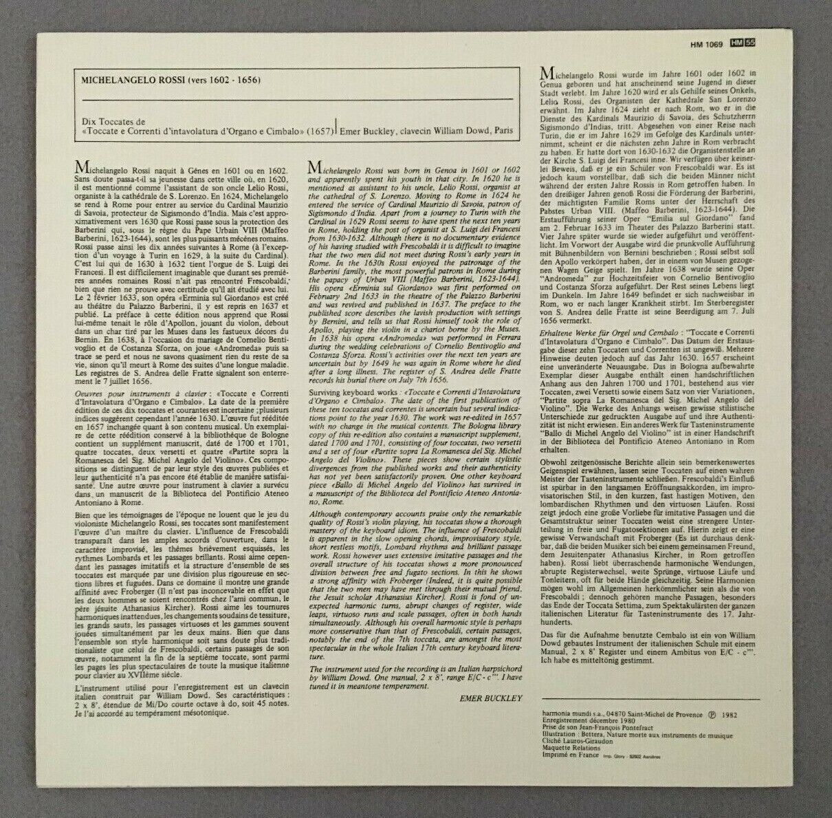 J096 Rossi Toccatas Buckley Harpsichord Harmonia Mundi France HM 1069 Stereo