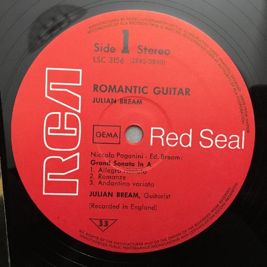 L169 Bream Romantic Guitar Paganini Mendelssohn Schubert RCA LSC 3156 Stereo