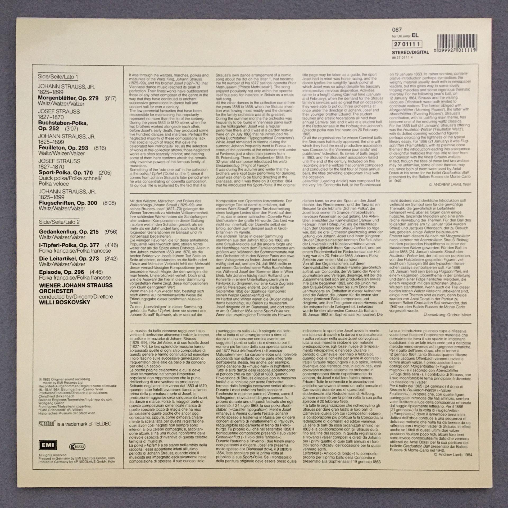 L182 J. & J. Strauss Waltzes Polkas Boskovsky EMI 067 27 0111 1 Digital Stereo