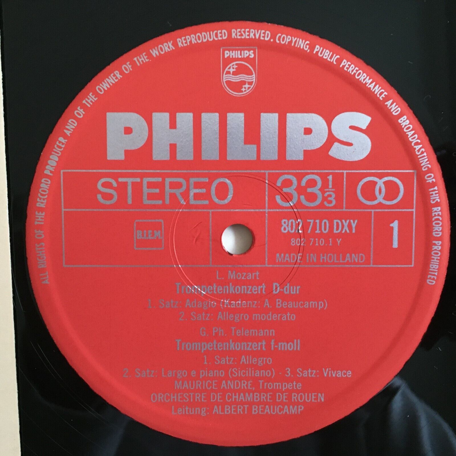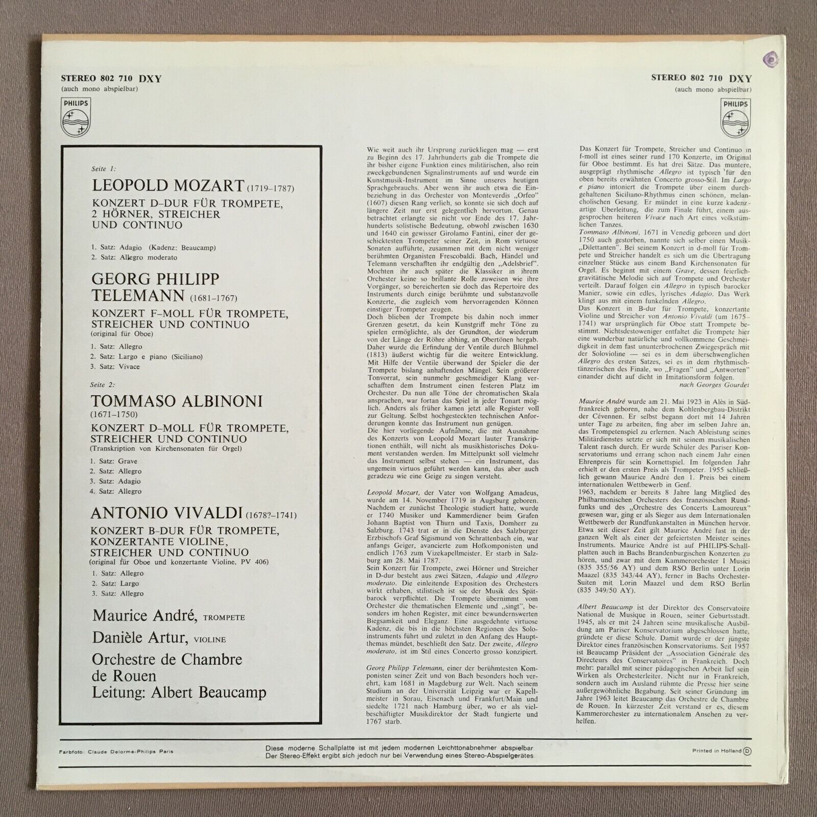 X784 Mozart/Telemann Trumpet Concertos Andre Beaucamp Philips 802 710 DXY Stereo