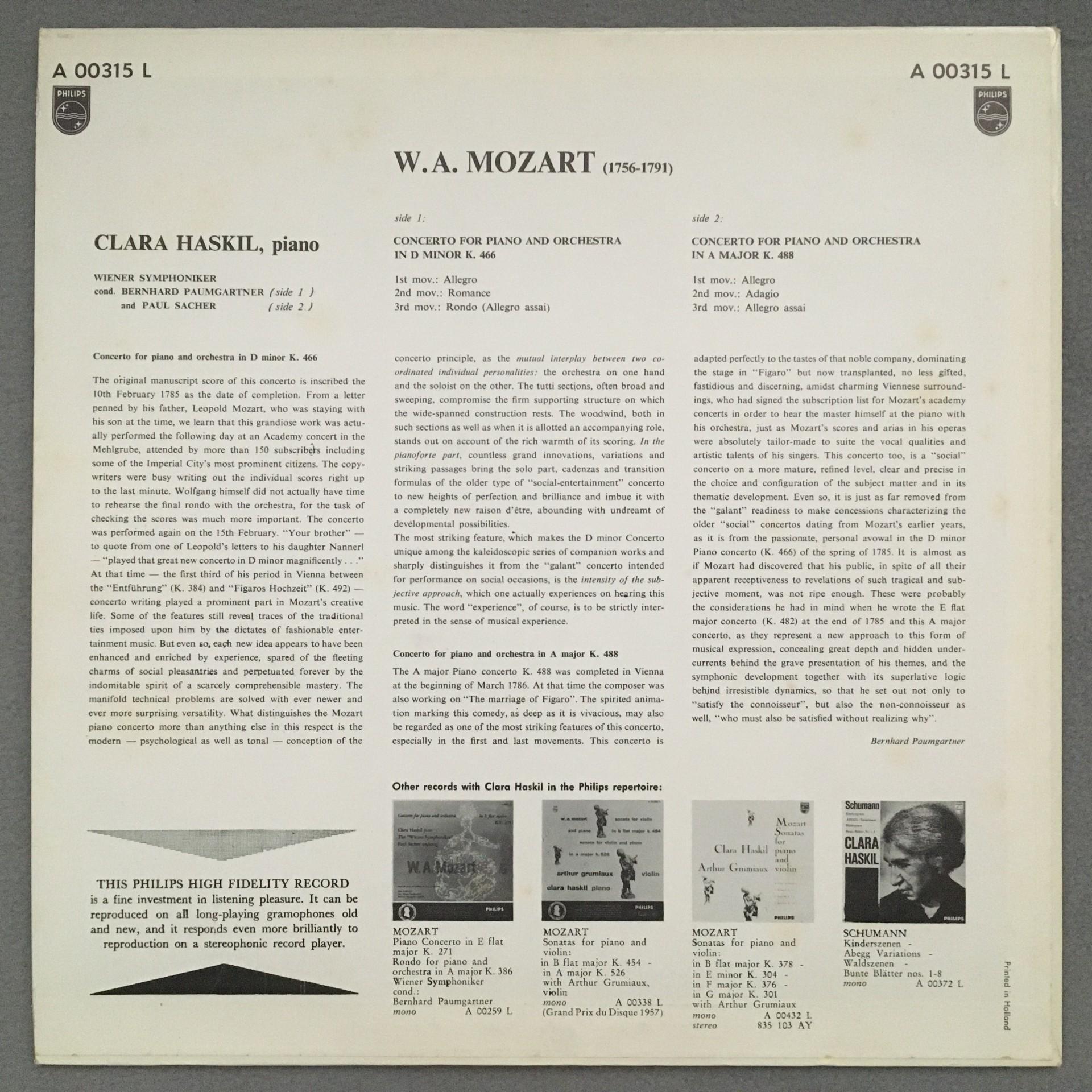 L239 Mozart Piano Concertos Haskil Paumgartner Sacher VSO Philips A 00315 L