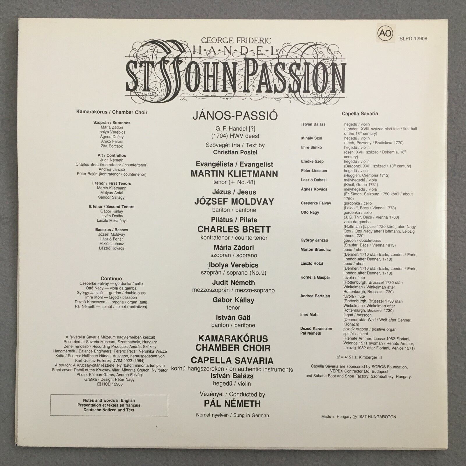 Y376 Handel St. John Passion Zadori Nemeth Hungaroton SLPD 12908 Digital Stereo