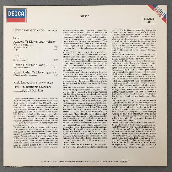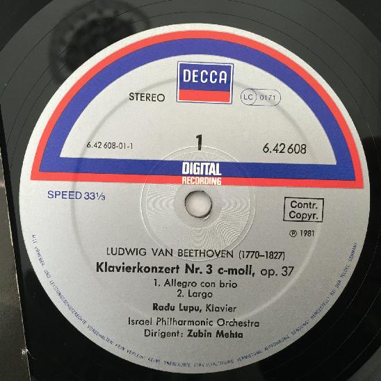 L338 Beethoven Piano Concerto No 3 Lupu Mehta DECCA 6.42608 AZ Digital Stereo