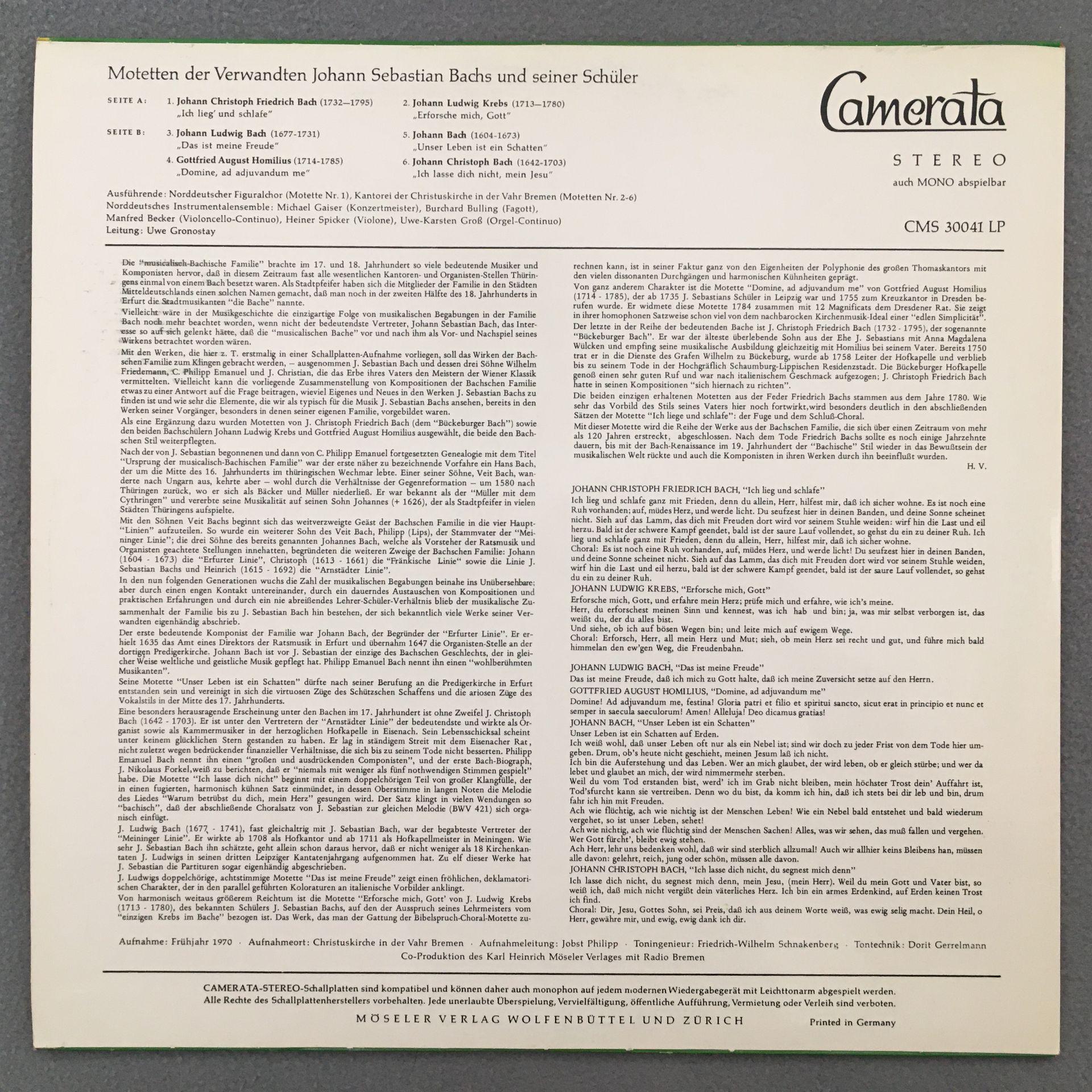 L430 Bach Family Motets Gaiser Becker Gronostay Camerata CMS 30041 Stereo
