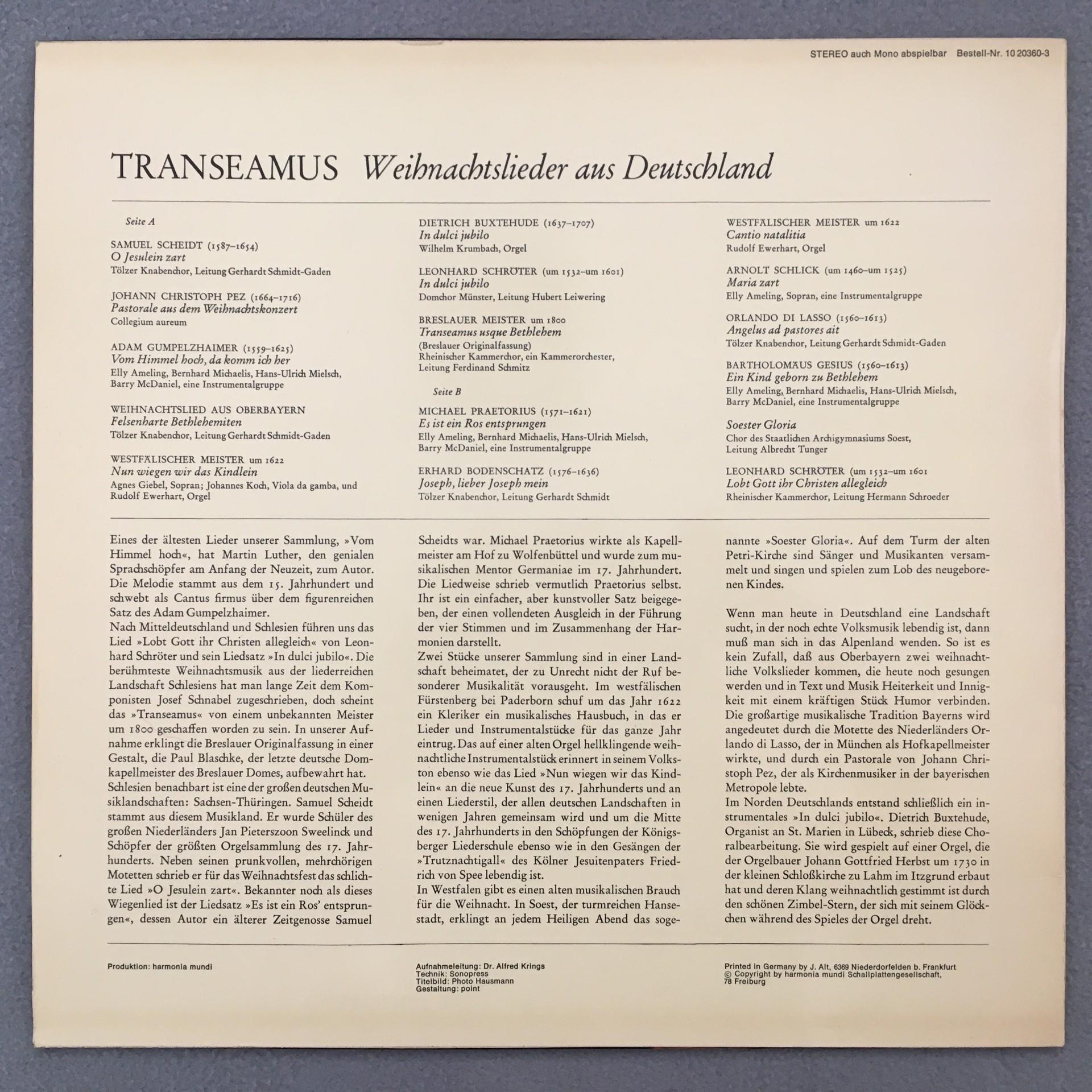 L434 Transeamus Christmas Songs from Germany Ameling HM 10 20360-3 Stereo