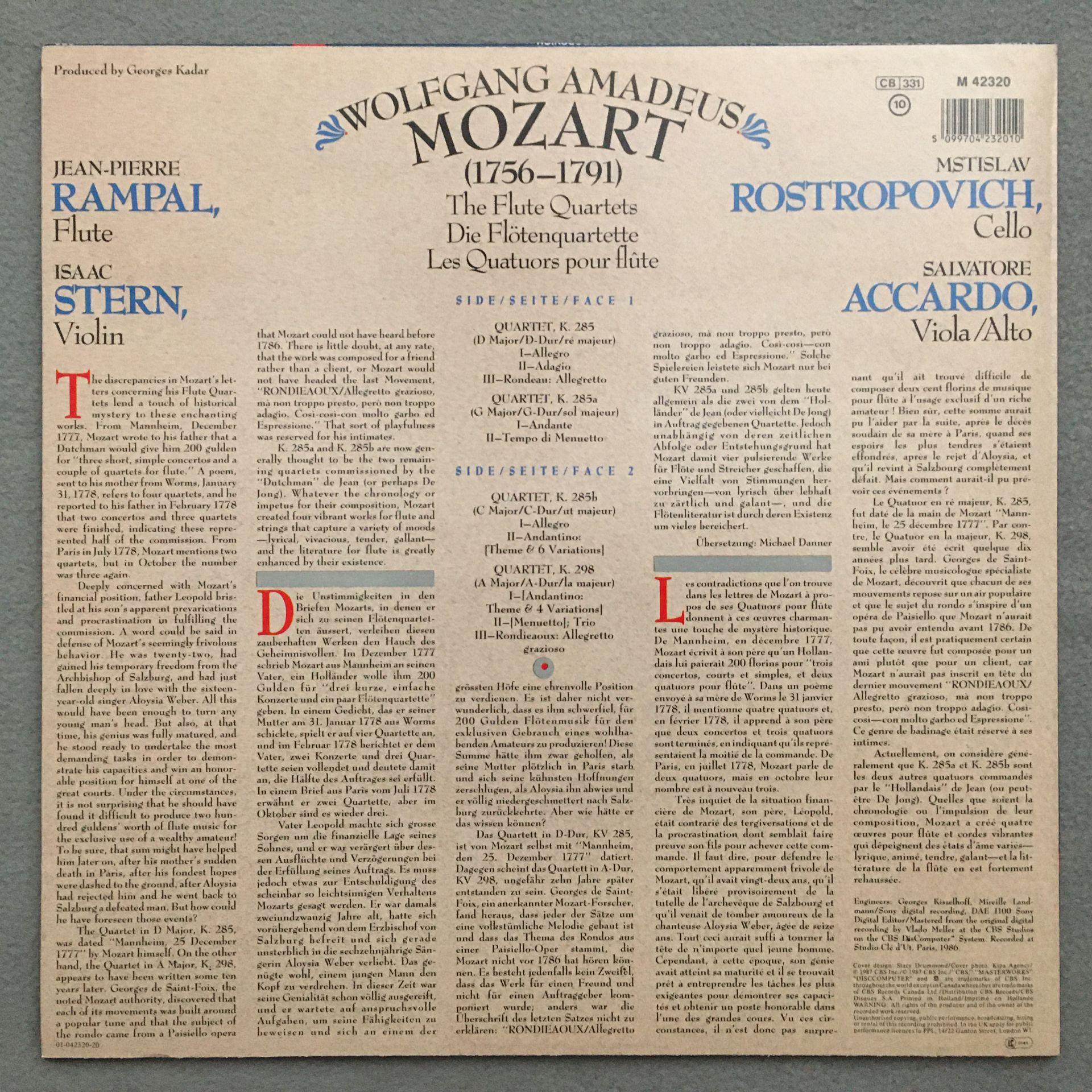 L608 Mozart Flute Quartets Rampal Stern Rostropovich CBS M 42320 Digital Stereo