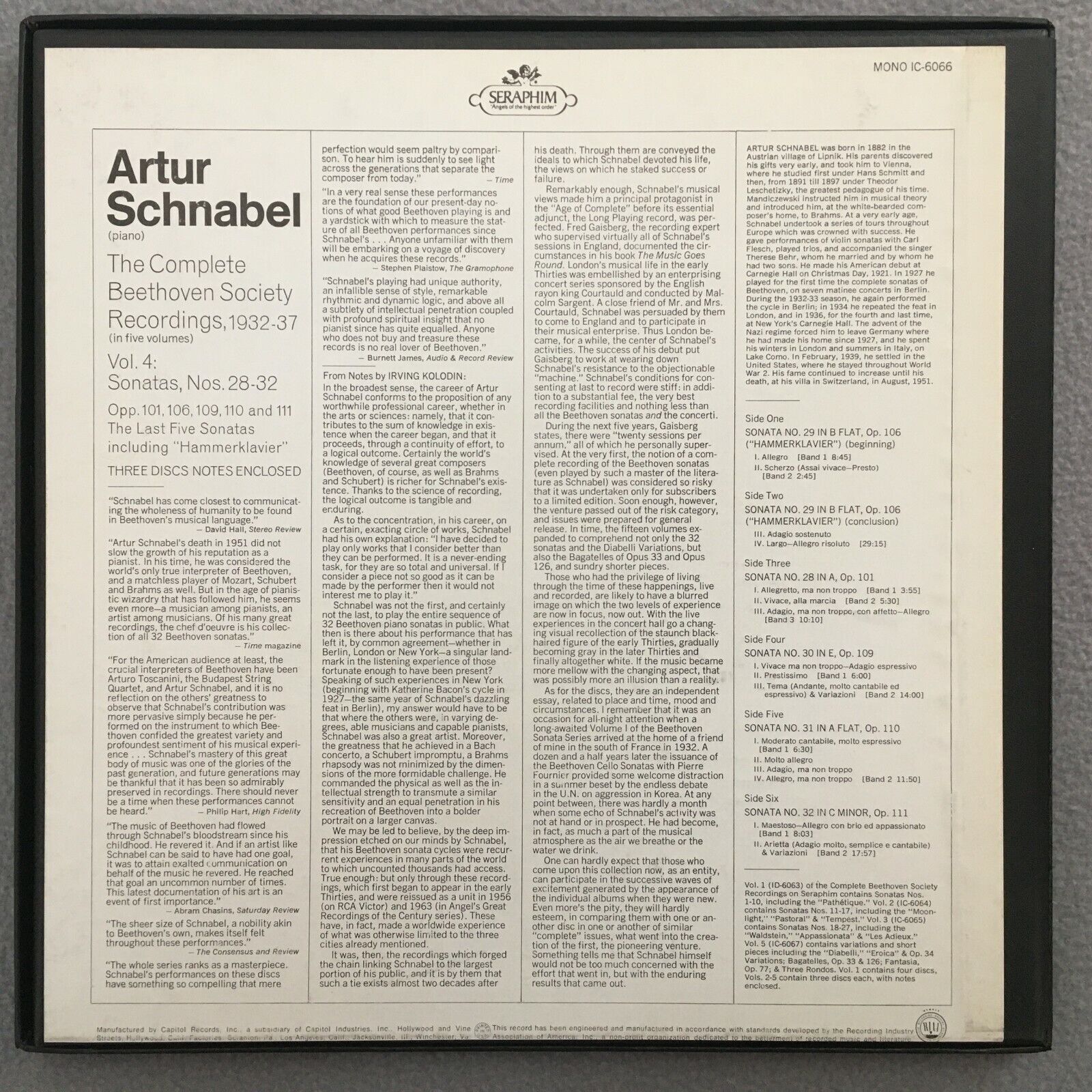 C158 Beethoven Piano Sonatas Vol. IV Schnabel 3LP Seraphim IC-6066