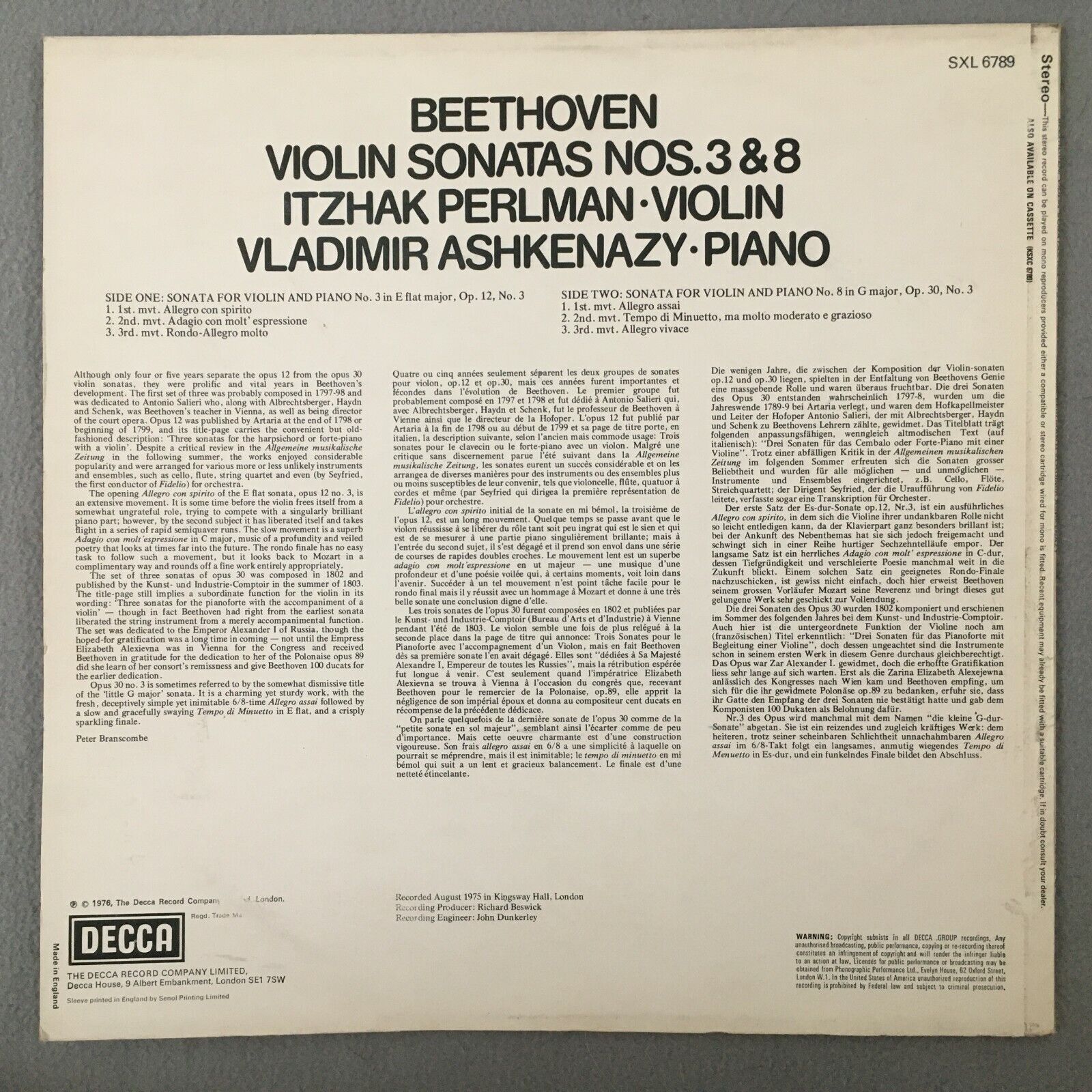 R788 Beethoven Violin Sonatas Perlman Ashkenazy DECCA SXL 6789 Stereo