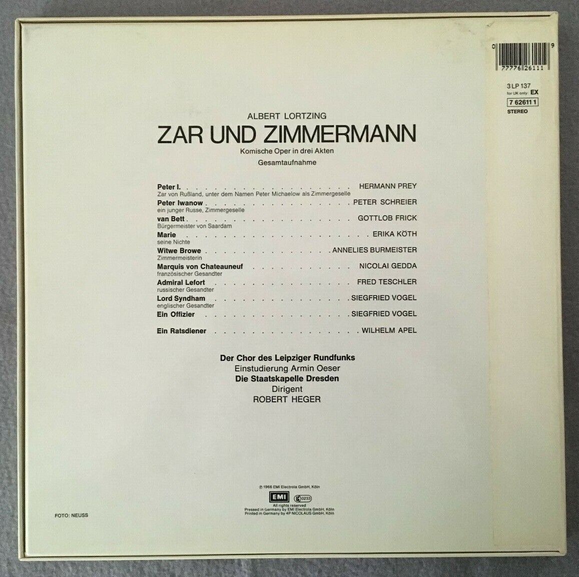 B622 Lortzing Zar und Zimmermann Prey Schreier Heger 3LP EMI 7 62611 1 Stereo