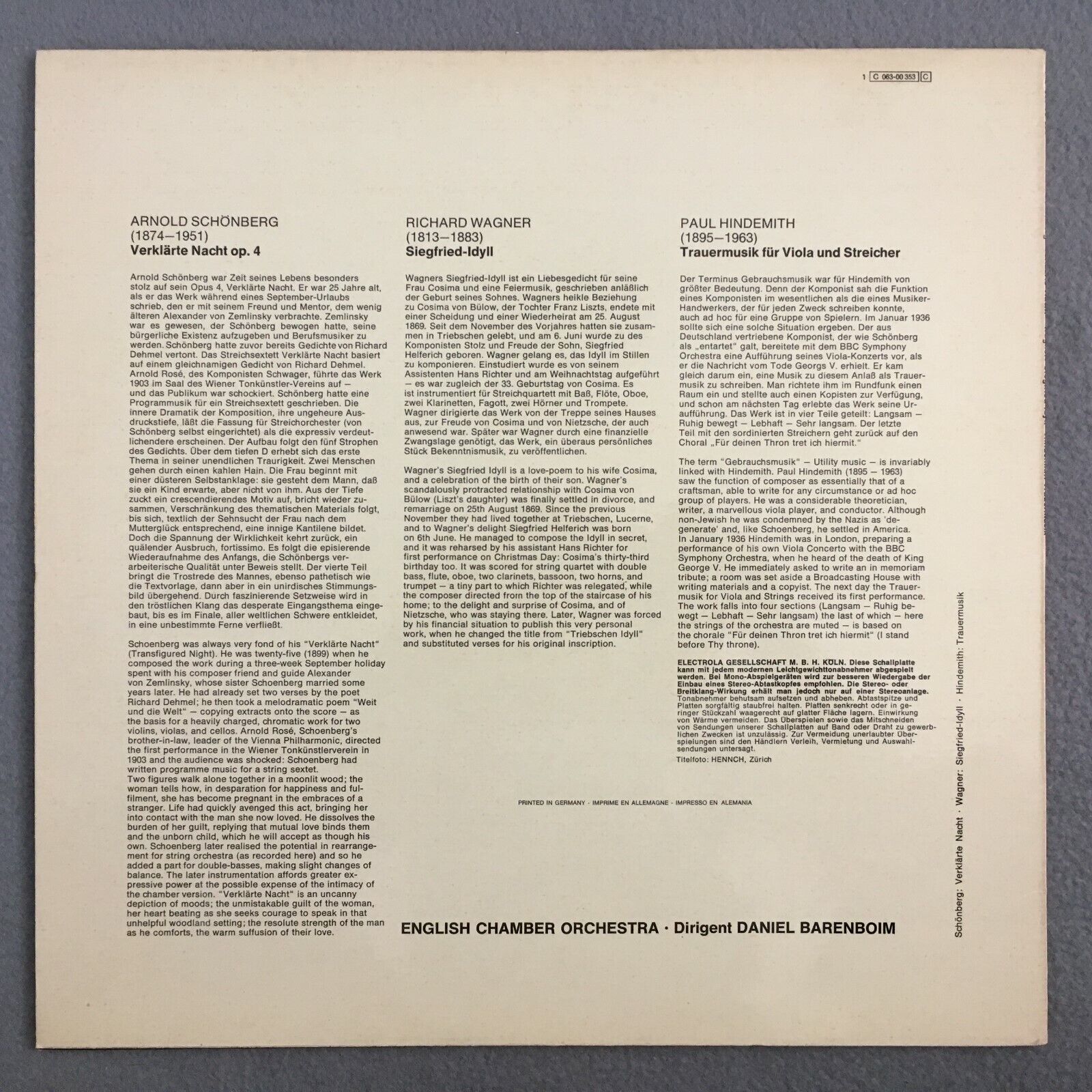 Z915 Schönberg Wagner Siegfried Hindemith Barenboim EMI 1 C 063-00 353 Stereo