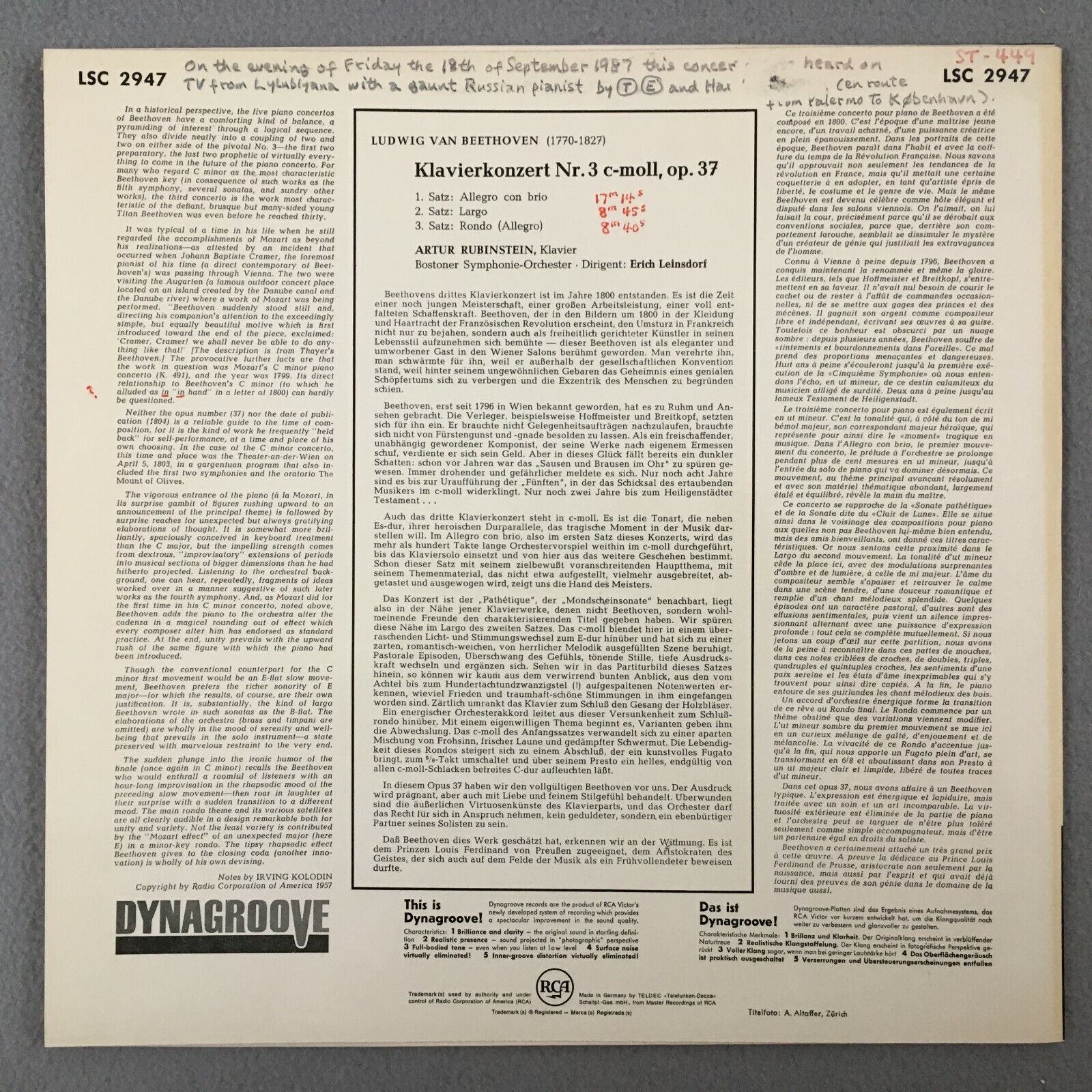 Y253 Beethoven Piano Concerto No.3 Rubinstein Leinsdorf RCA LSC-2947 Stereo