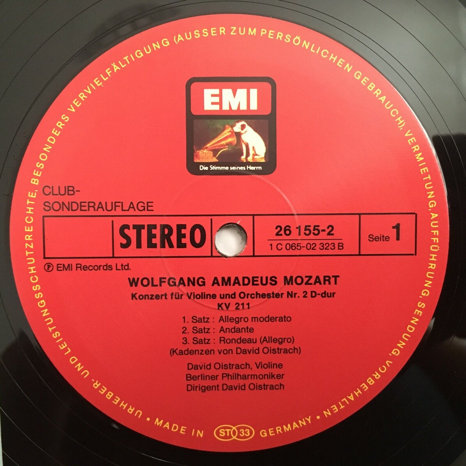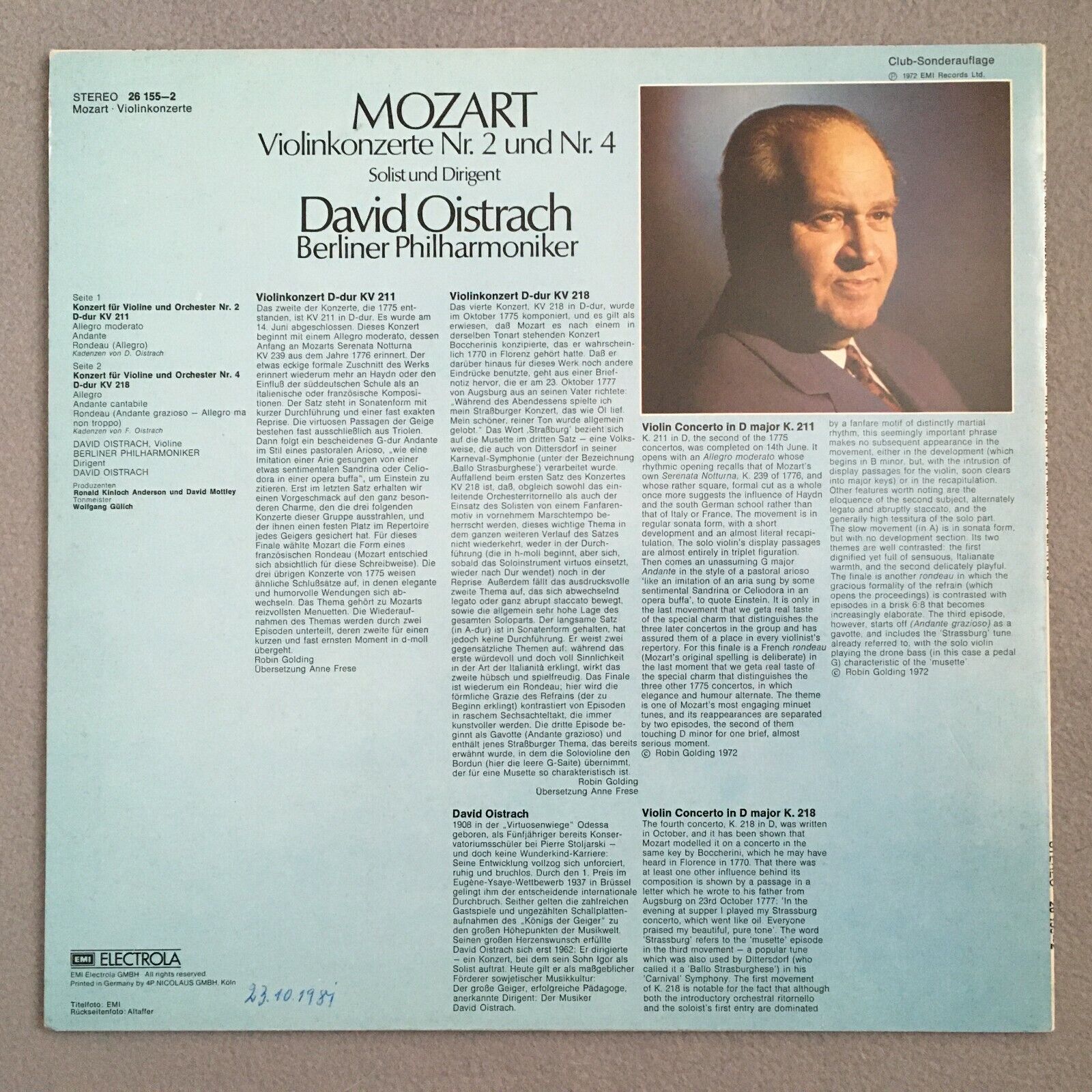 Y613 Mozart Violin Concertos No.2 & No.4 Oistrakh BPO EMI 26 155-2 Stereo