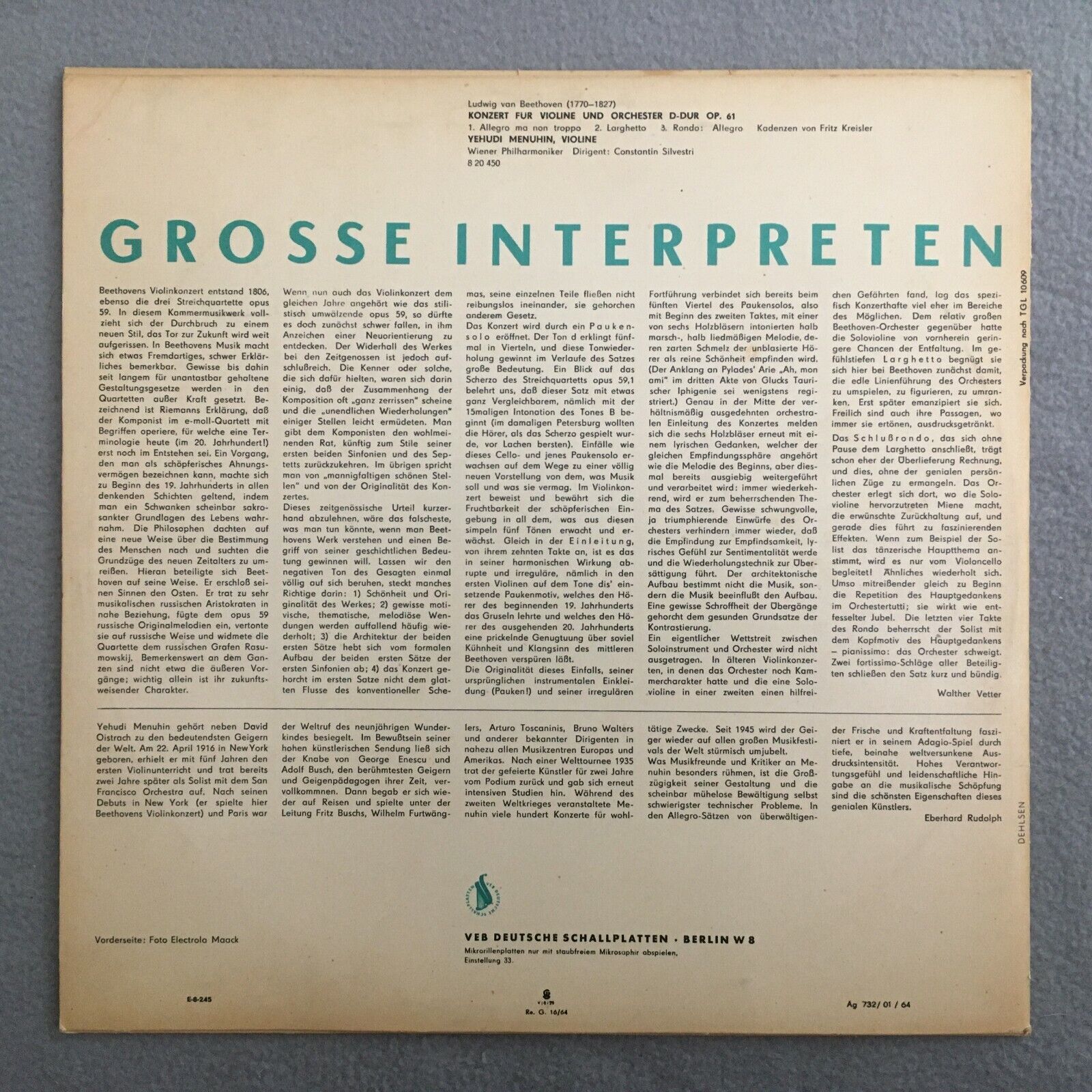 Y909 Beethoven Violin Concerto Menuhin Silvestri VPO Eterna 820 450