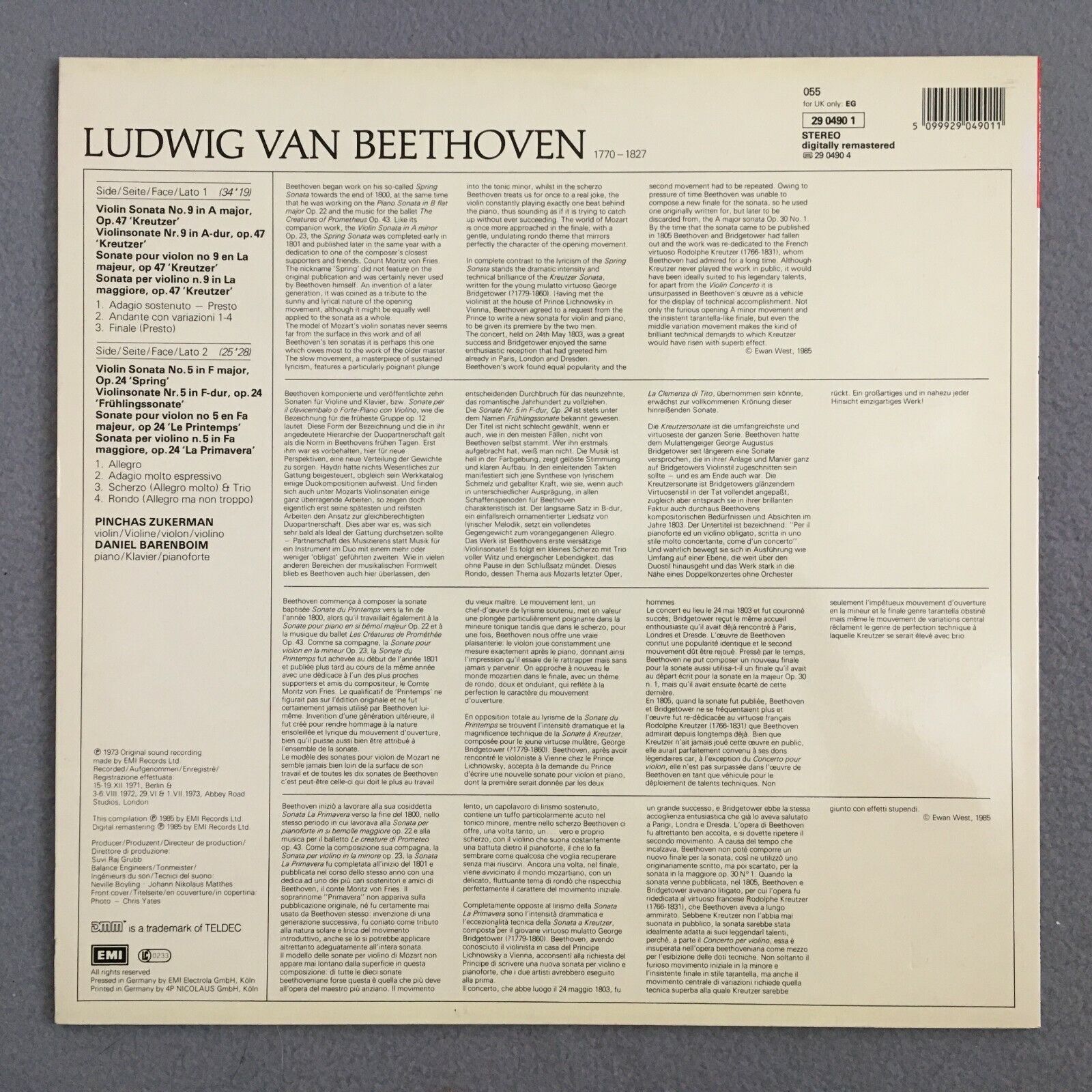 V336 Beethoven Sonatas Zukerman Barenboim EMI 055 29 0490 1 Digital Stereo