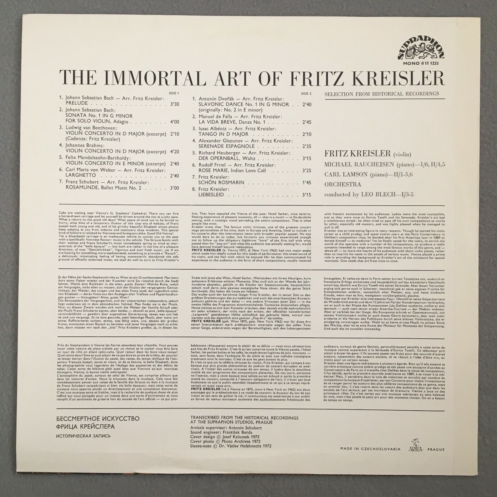 V205 The Immortal Art of Fritz Kreisler Raucheisen Blech Supraphon 1011 1233