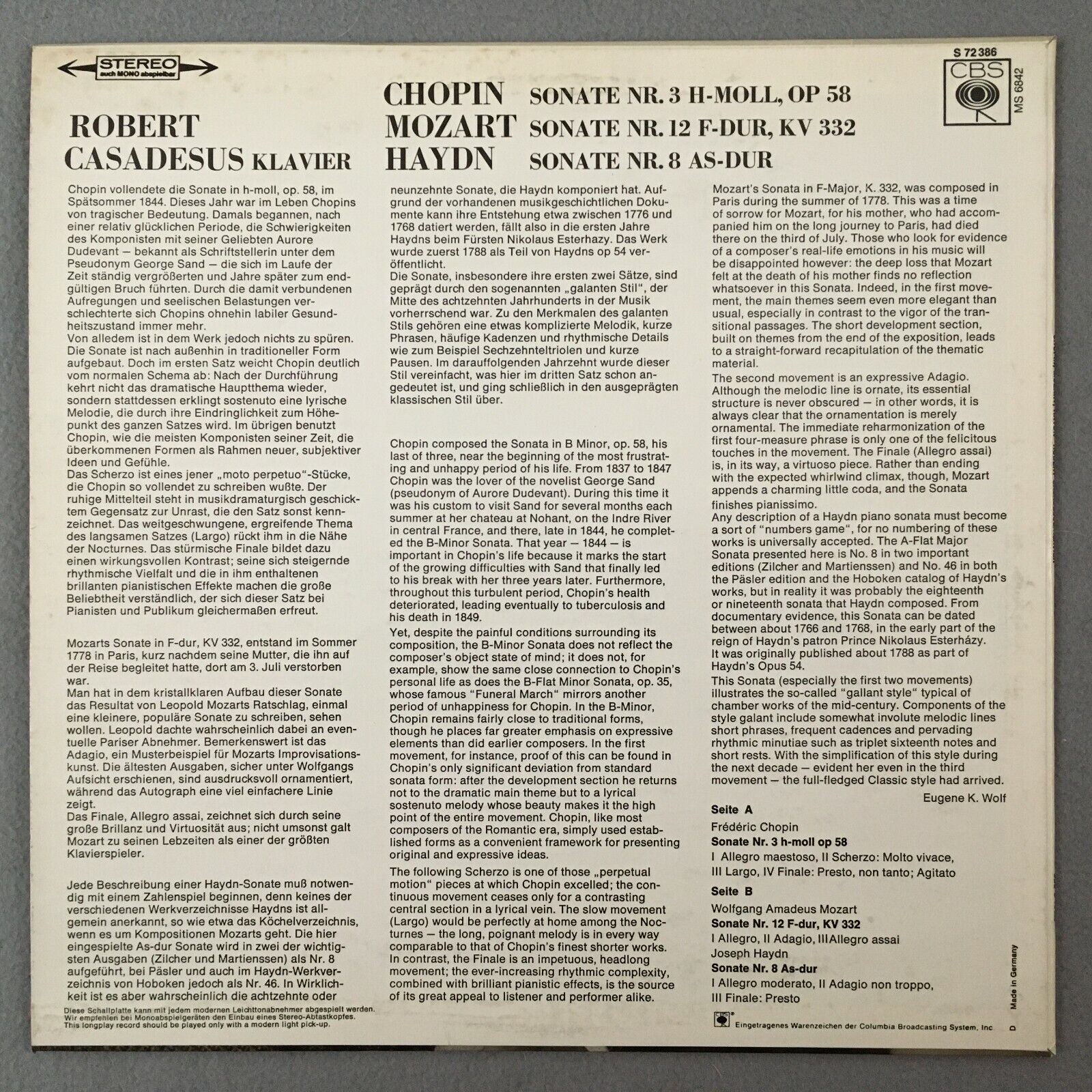 R750 Chopin Mozart Haydn Piano Sonatas Casadesus CBS S 72 386 Stereo