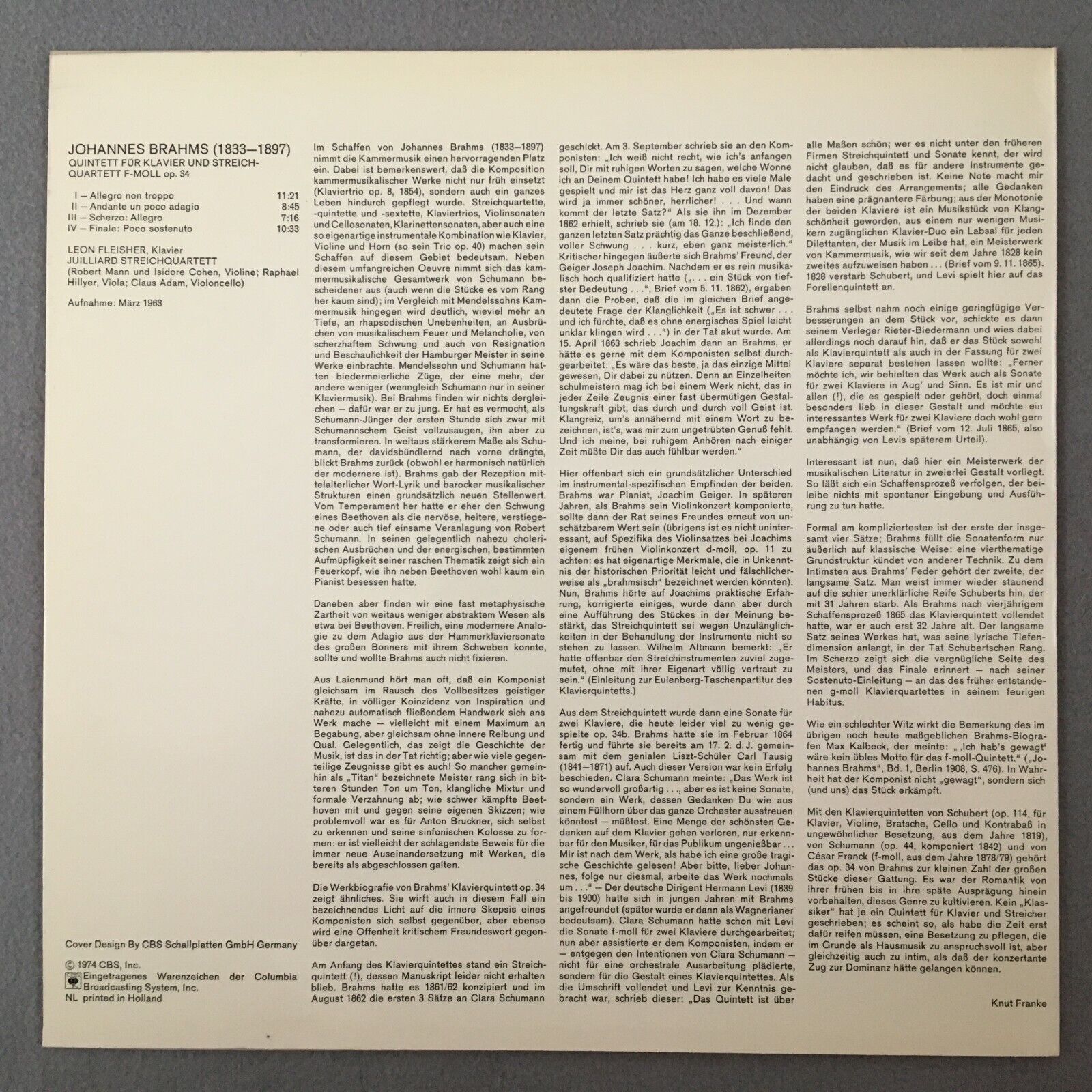 R751 Brahms Piano Quintet Fleisher Juilliard String Quartet CBS 61 550 Stereo