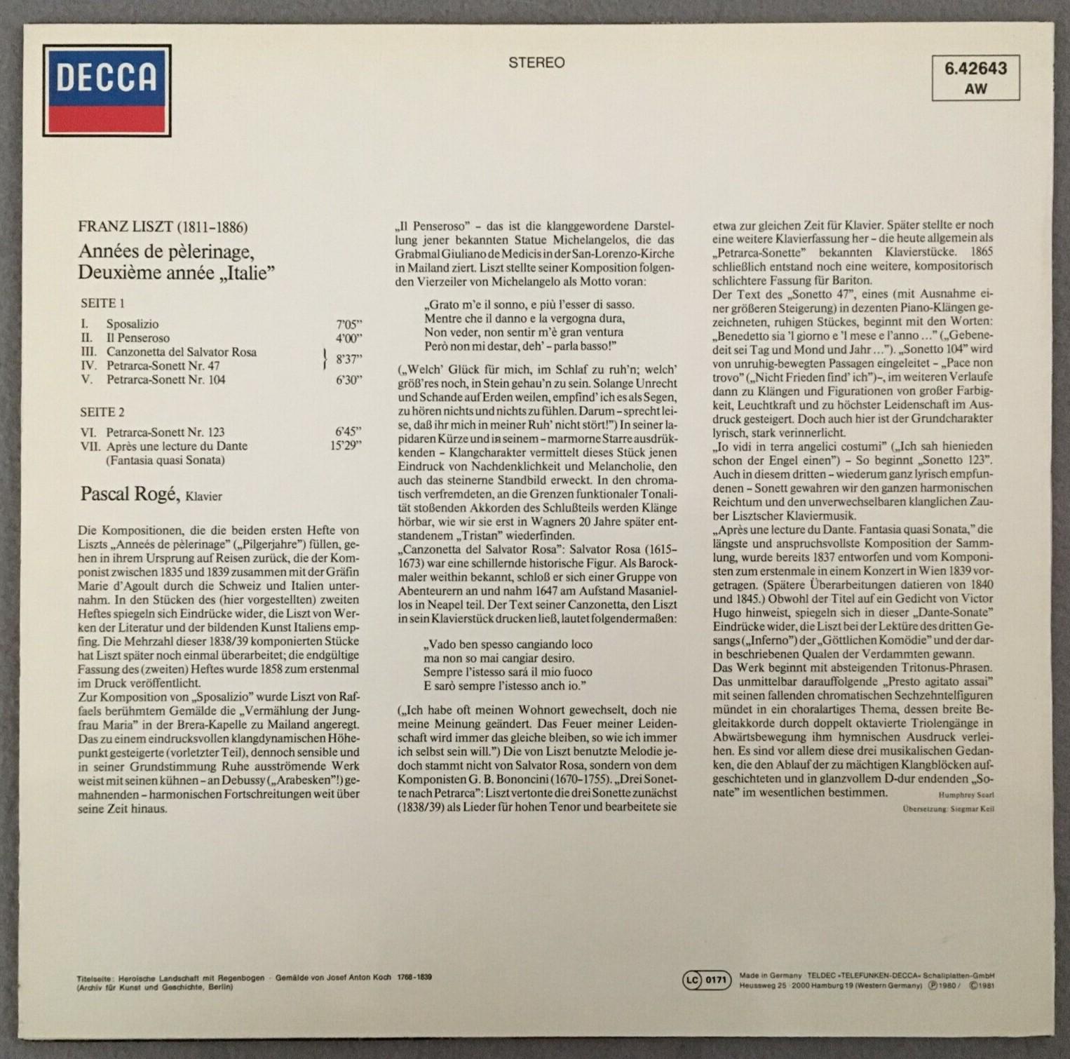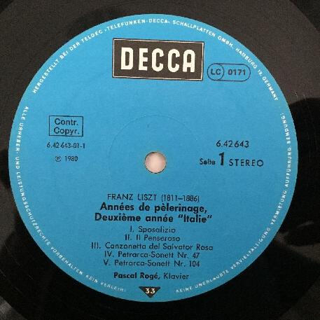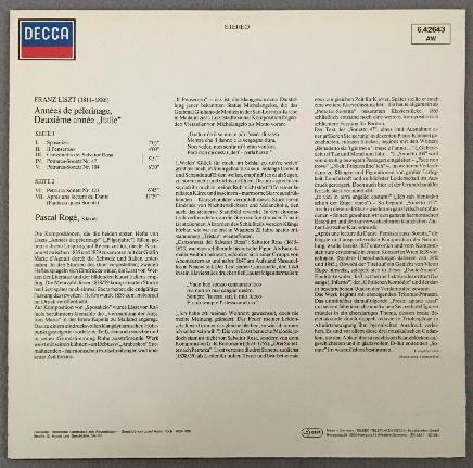 P455 Liszt Annees de pelerinage Pascal Roge DECCA 6.42643 AW Stereo