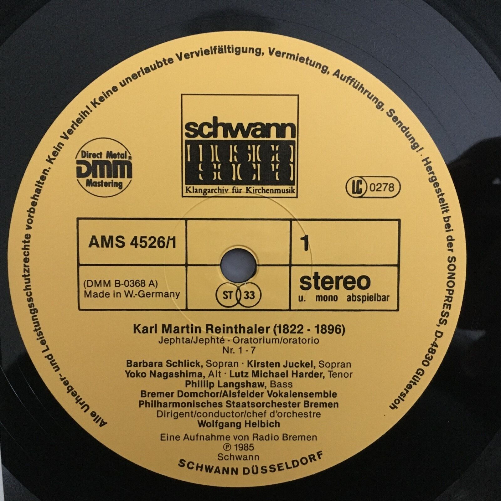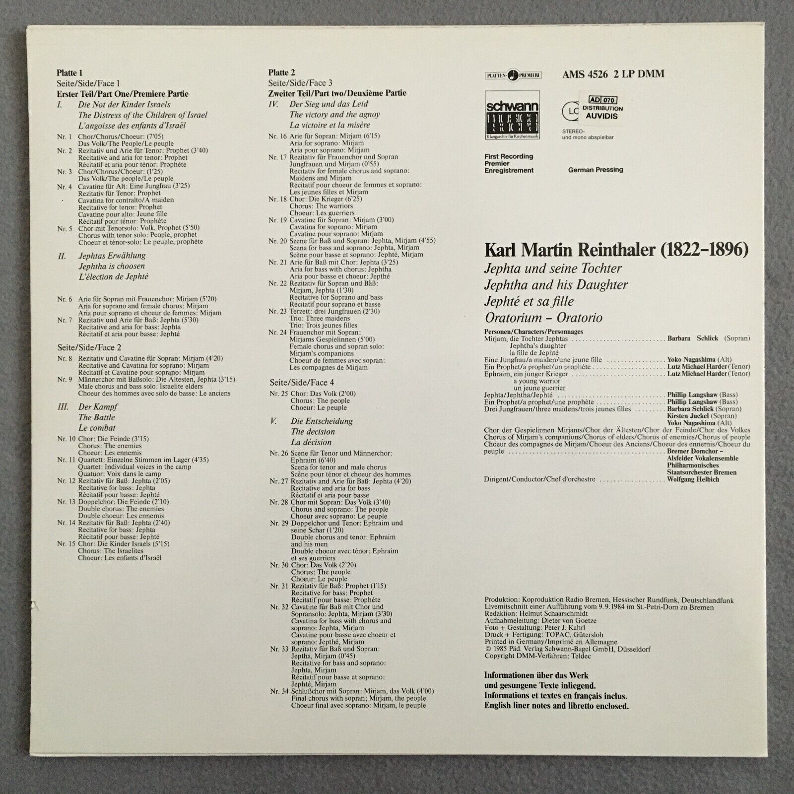 Z138 Reinthaler Jephta Schlick Helbich 2LP Schwann AMS 4526 Digital Stereo