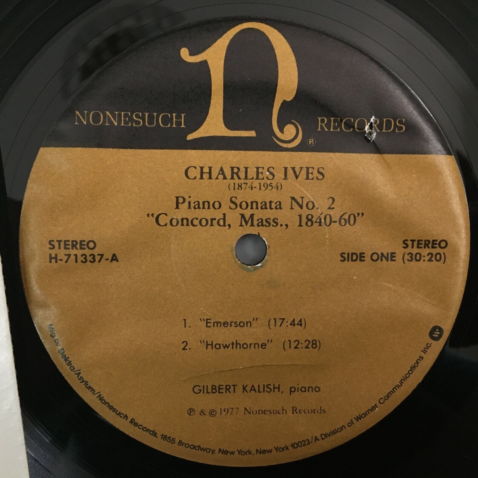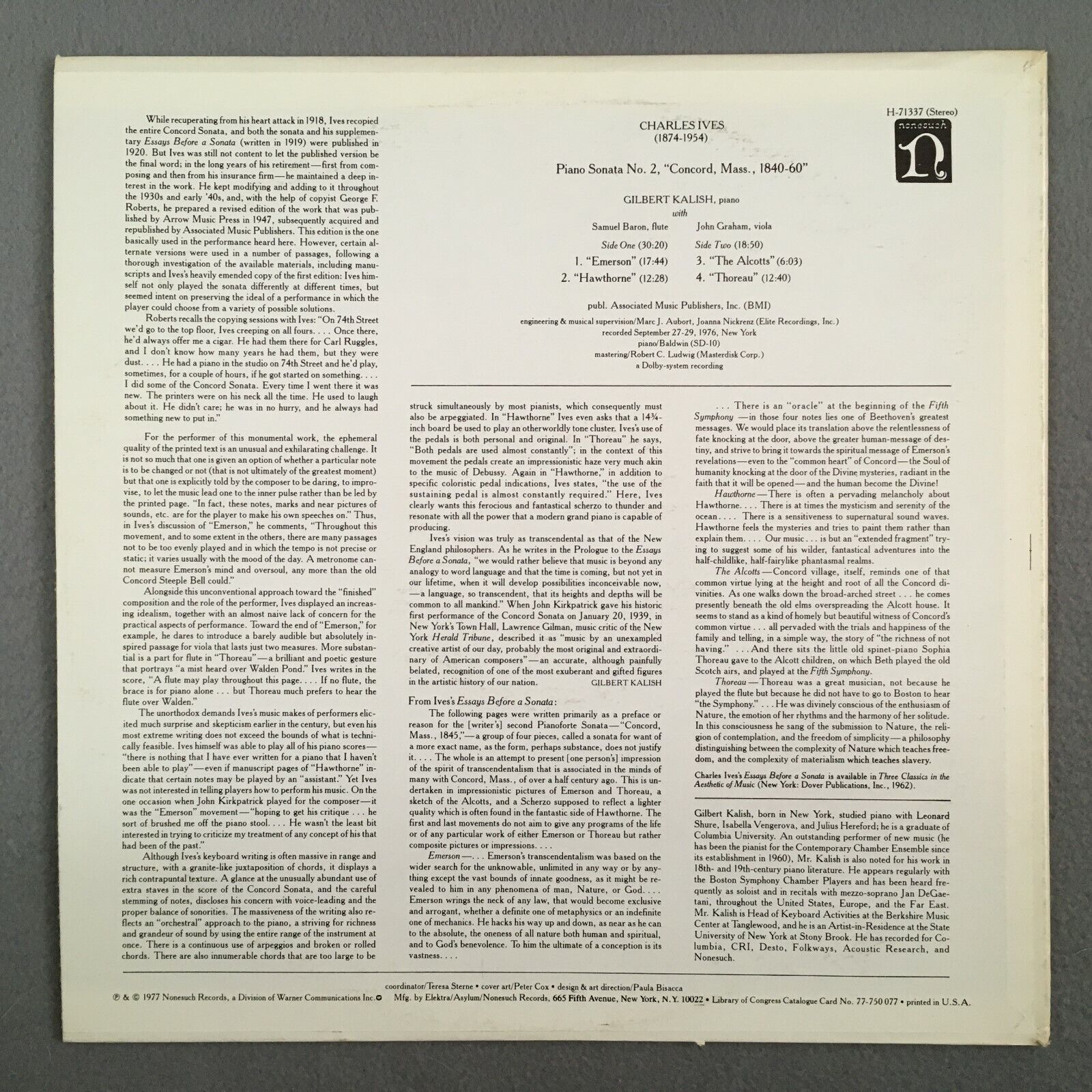Z966 Ives Piano Sonata No.2 Concord Mass Kalish Piano Nonesuch H-71337 Stereo