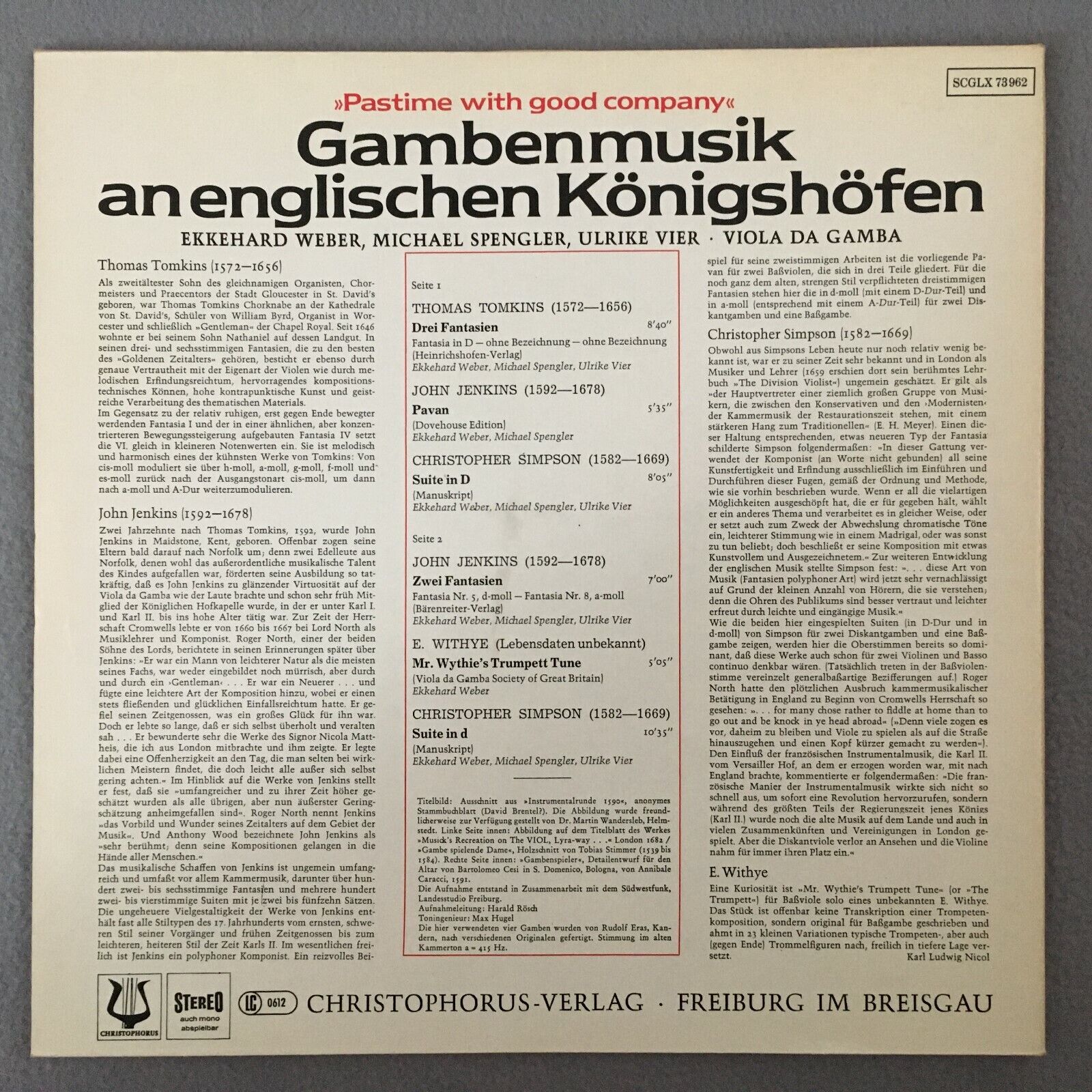 Y114 Gambenmusik English Royal Courts Vier Spengler Christophorus SGLX 73 962 St