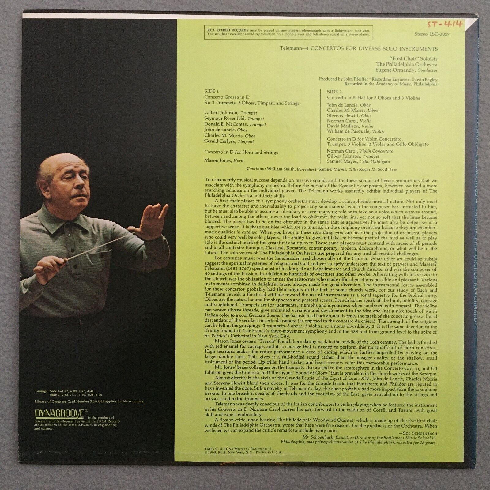 Y345 Telemann 4 Concertos " First Chair " Soloists Ormandy RCA LSC-3057 Stereo