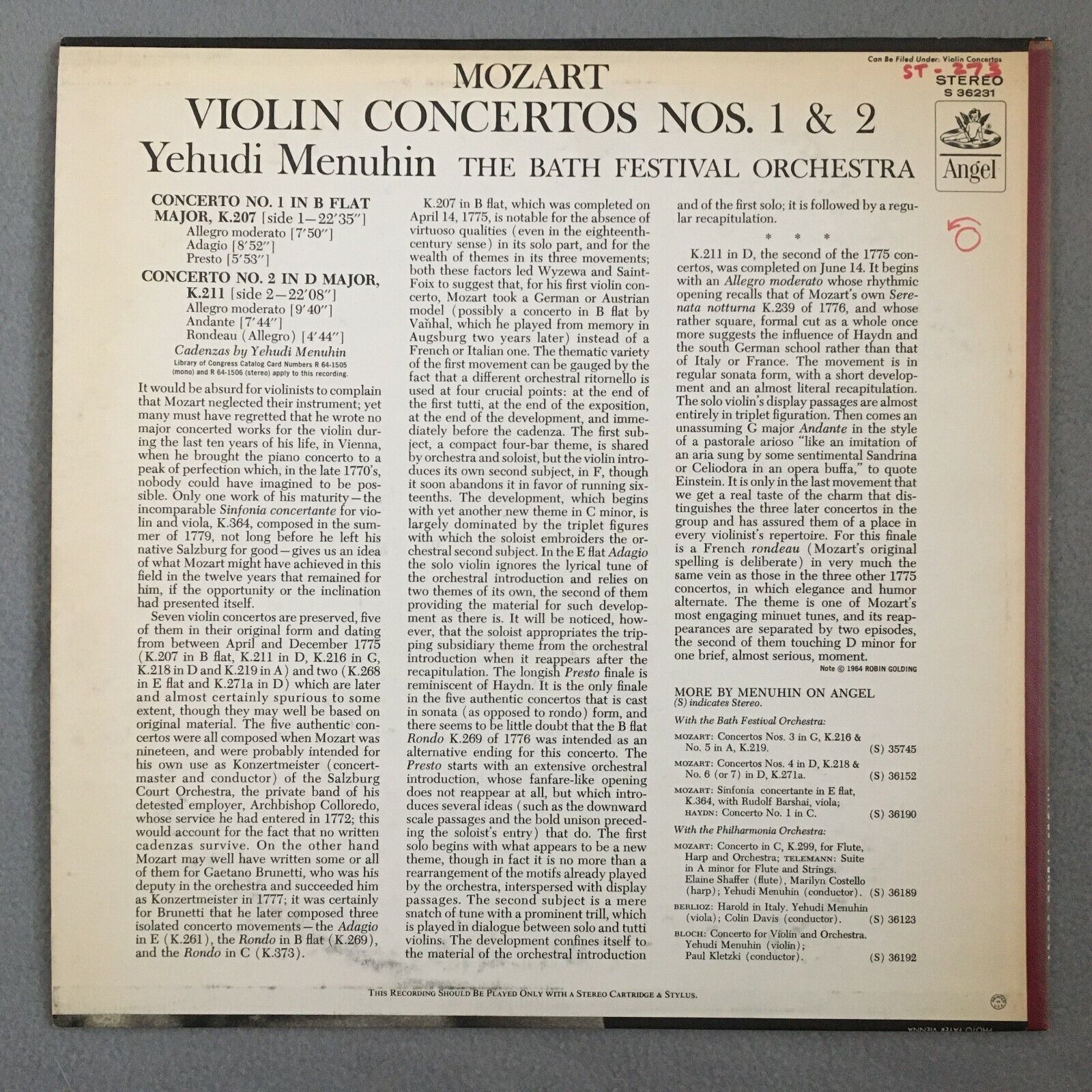 Y618 Mozart Violin Concertos No.1 & No.2 Menuhin Angel S 36231 Stereo