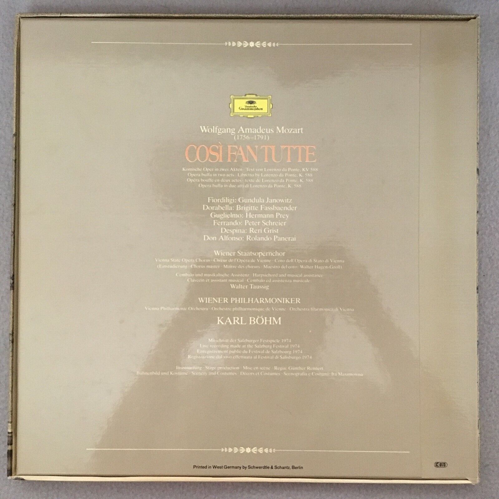 G051 Mozart Cosi fan Tutte Fassbaender Schreier Bohm VPO 3LP DGG 2740 206 Stereo