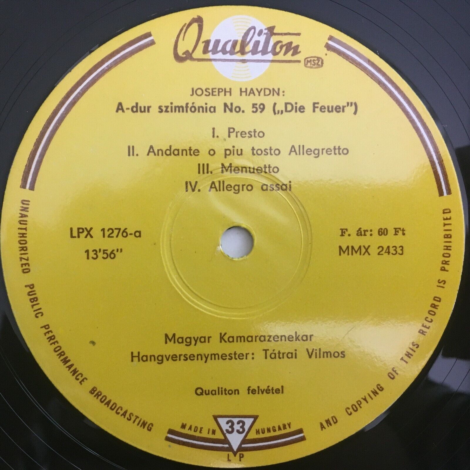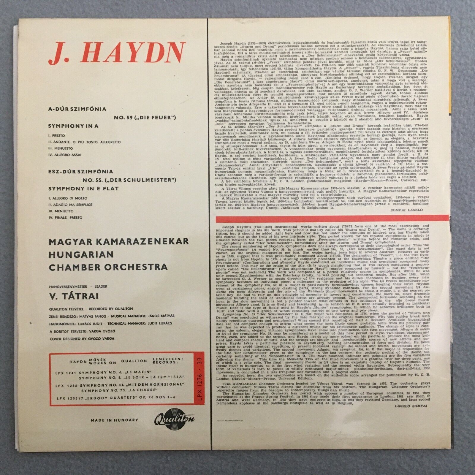 Y907 Haydn Symphonies No.59 & No.55 Tatrai Qualiton LPX 1276