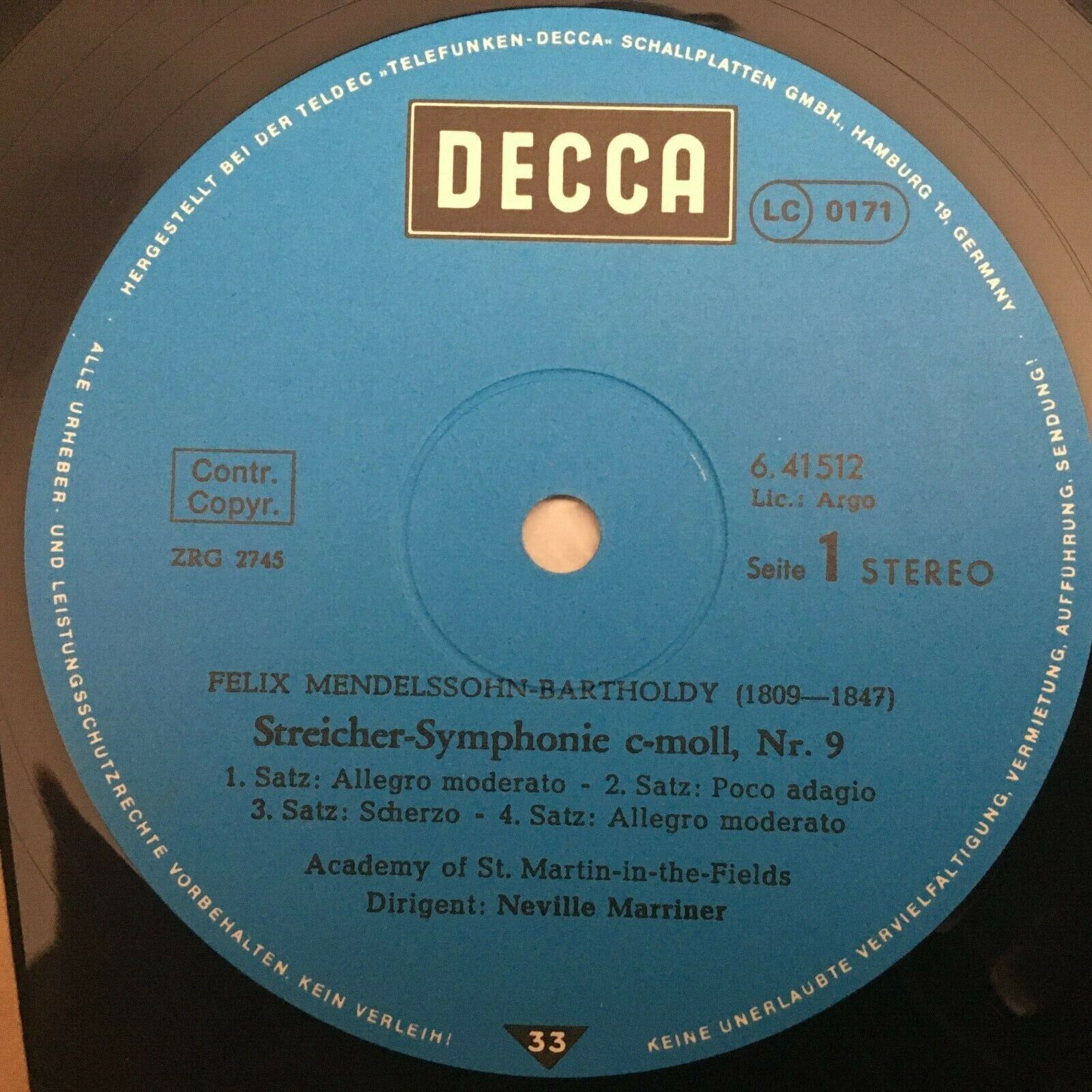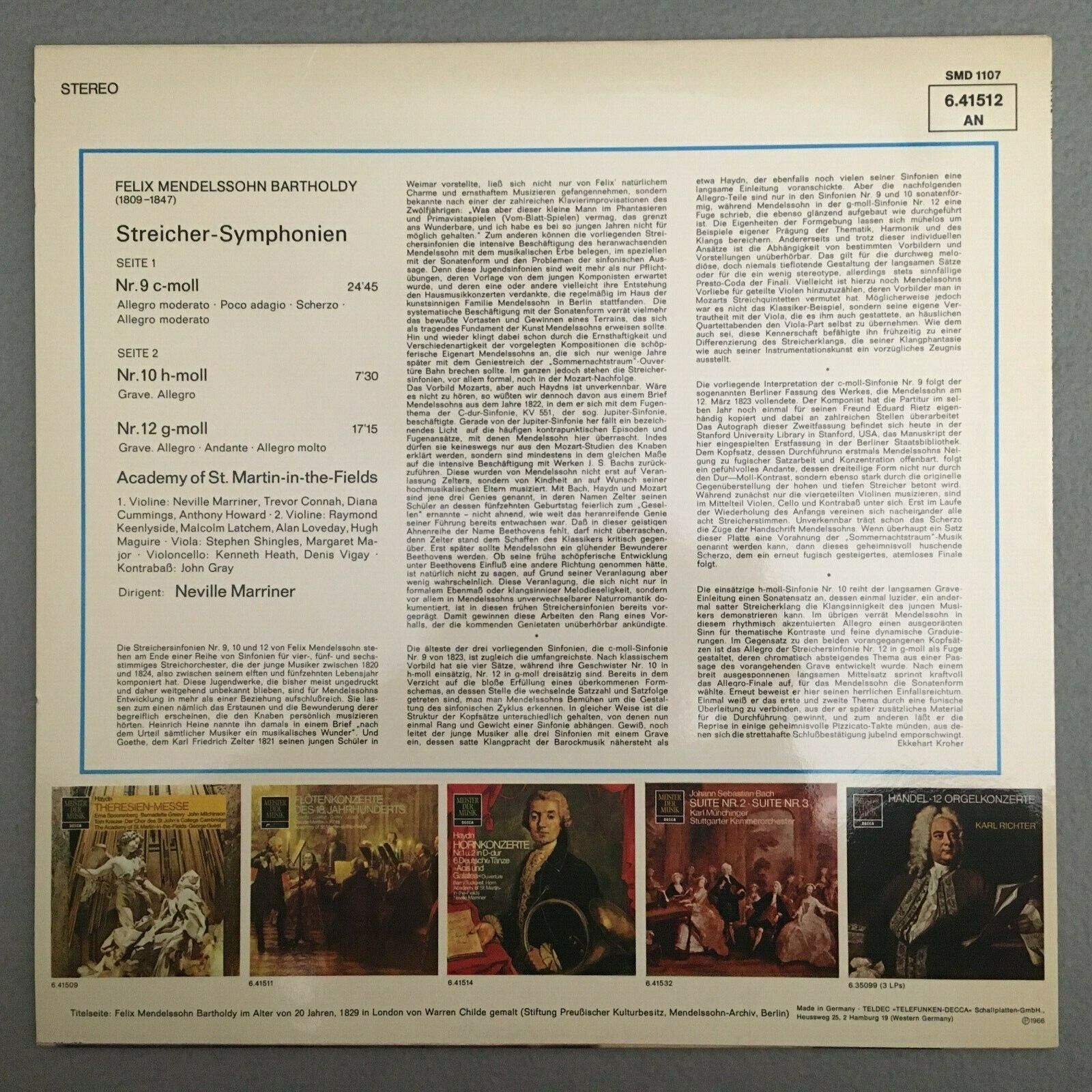V496 Mendelssohn String Symphonies No.9, 10, 12 Marriner DECCA 6.41512 AN Stereo
