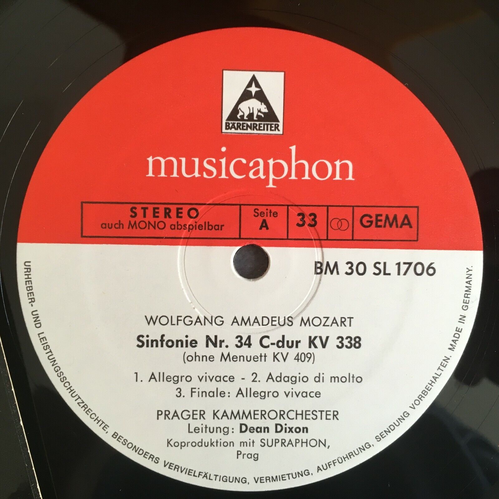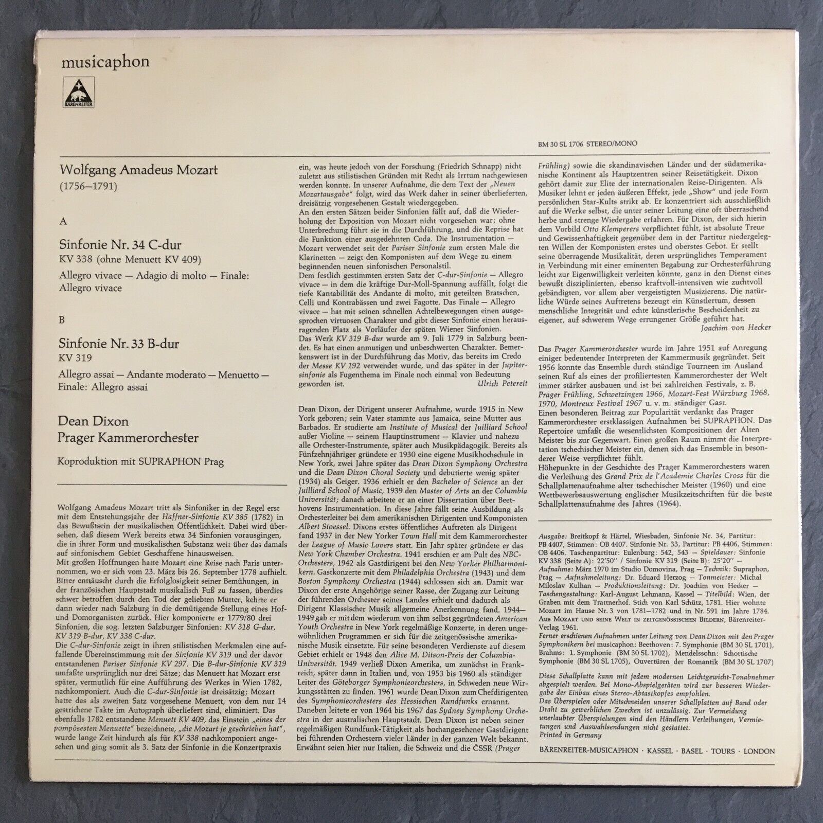 V517 Mozart Symphonies No.34 & No.33 Dixon Musicaphon BM 30 SL 1706 Stereo