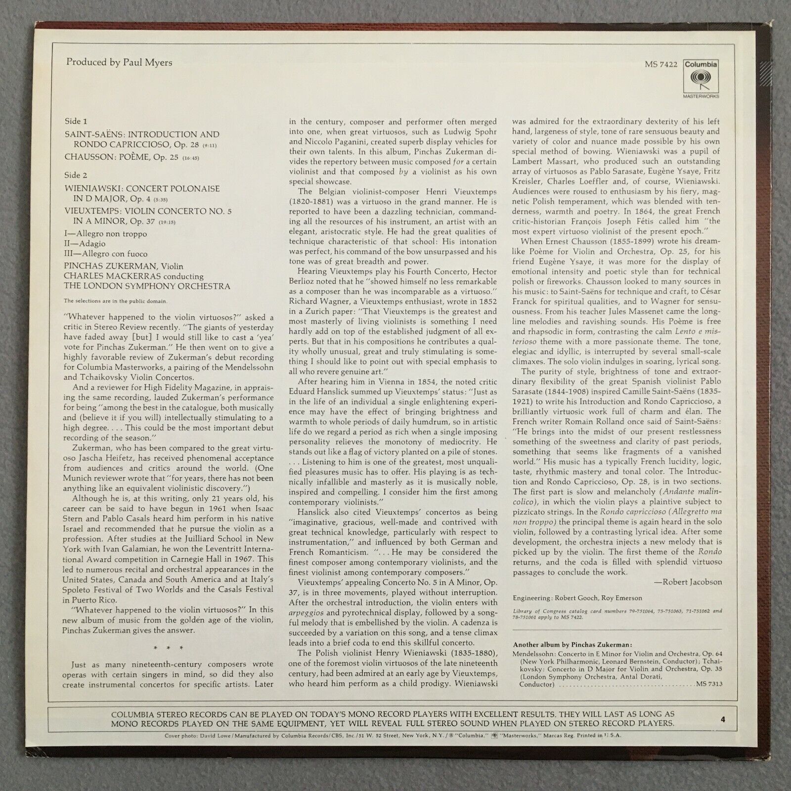 V212 Zukerman Chausson Poeme Saint-Saens Mackerras CBS MS 7422 Stereo