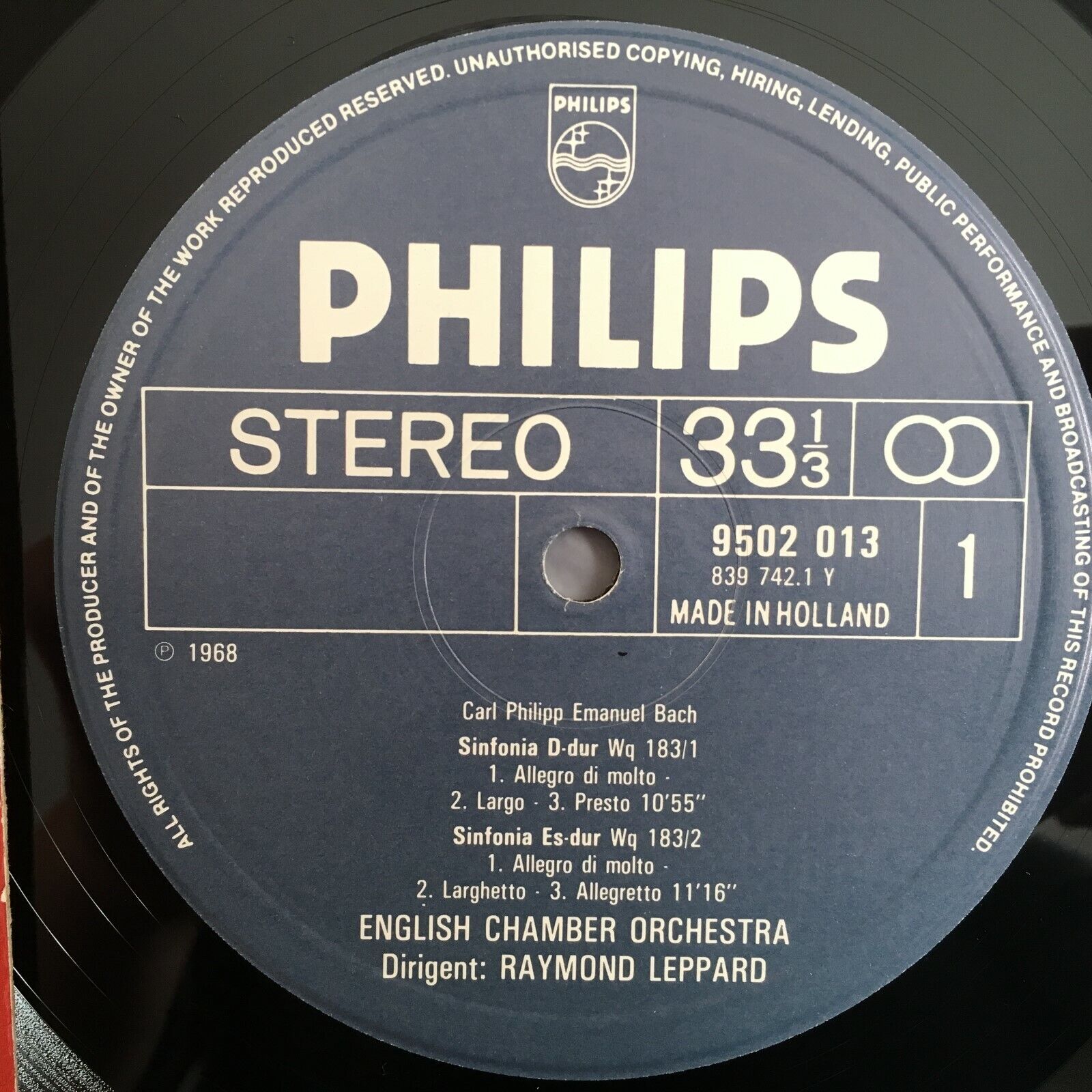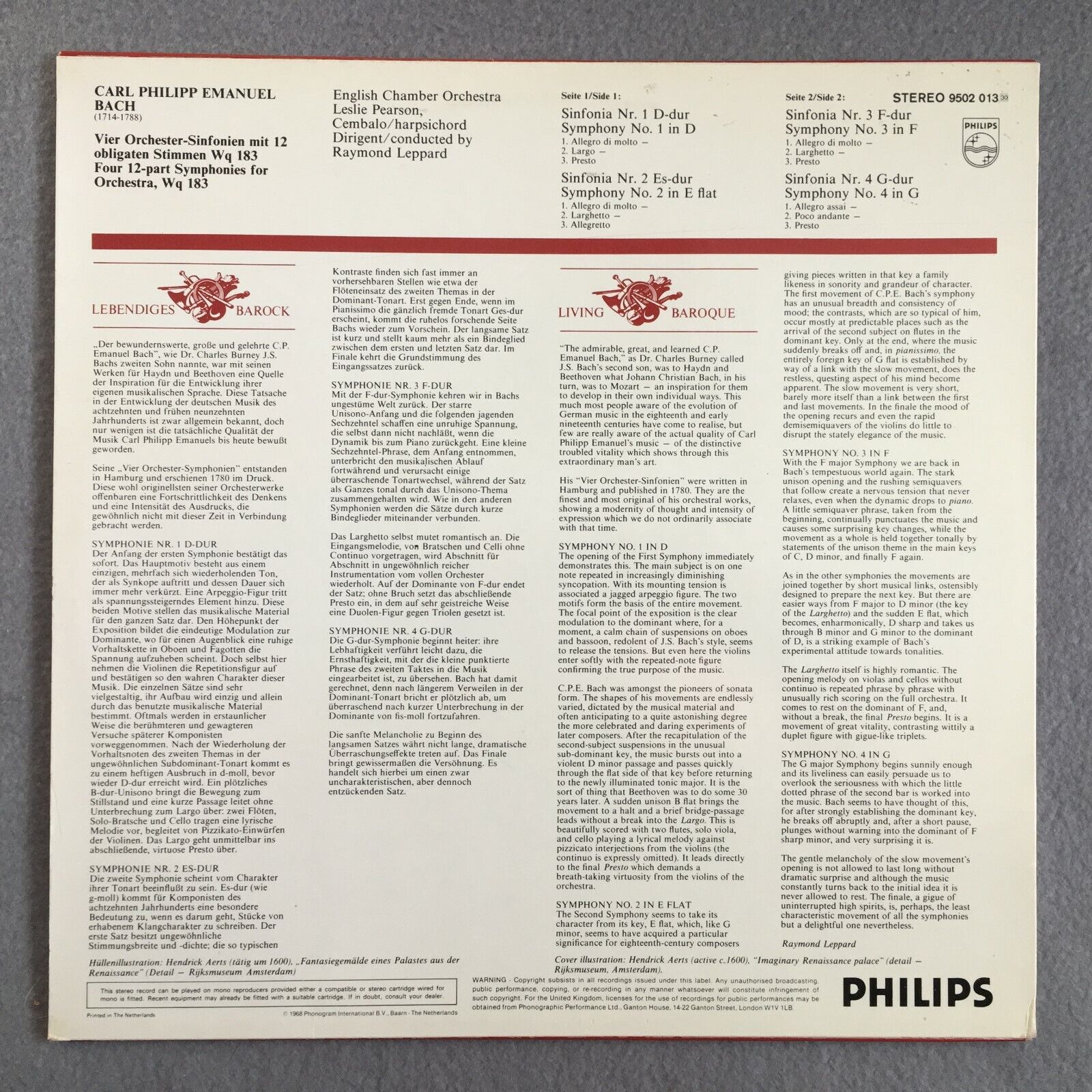 X398 C.P.E. Bach Hamburg Symphonies Pearson Leppard Philips 9502 013 Stereo