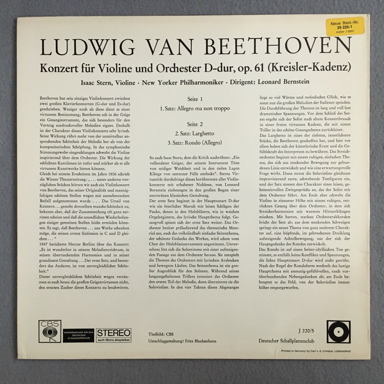 X485 Beethoven Violin Concerto Stern Bernstein CBS J 220/5 Stereo