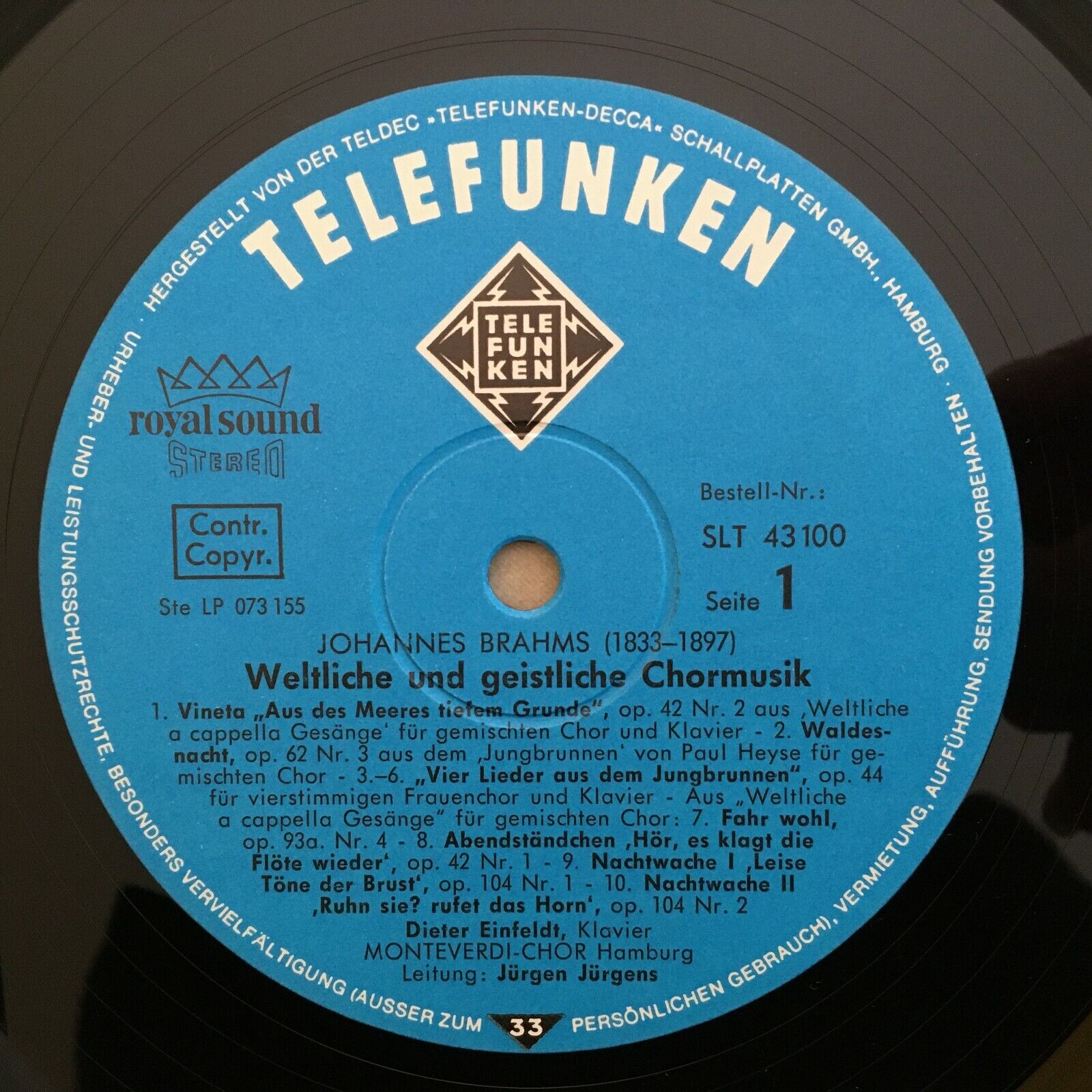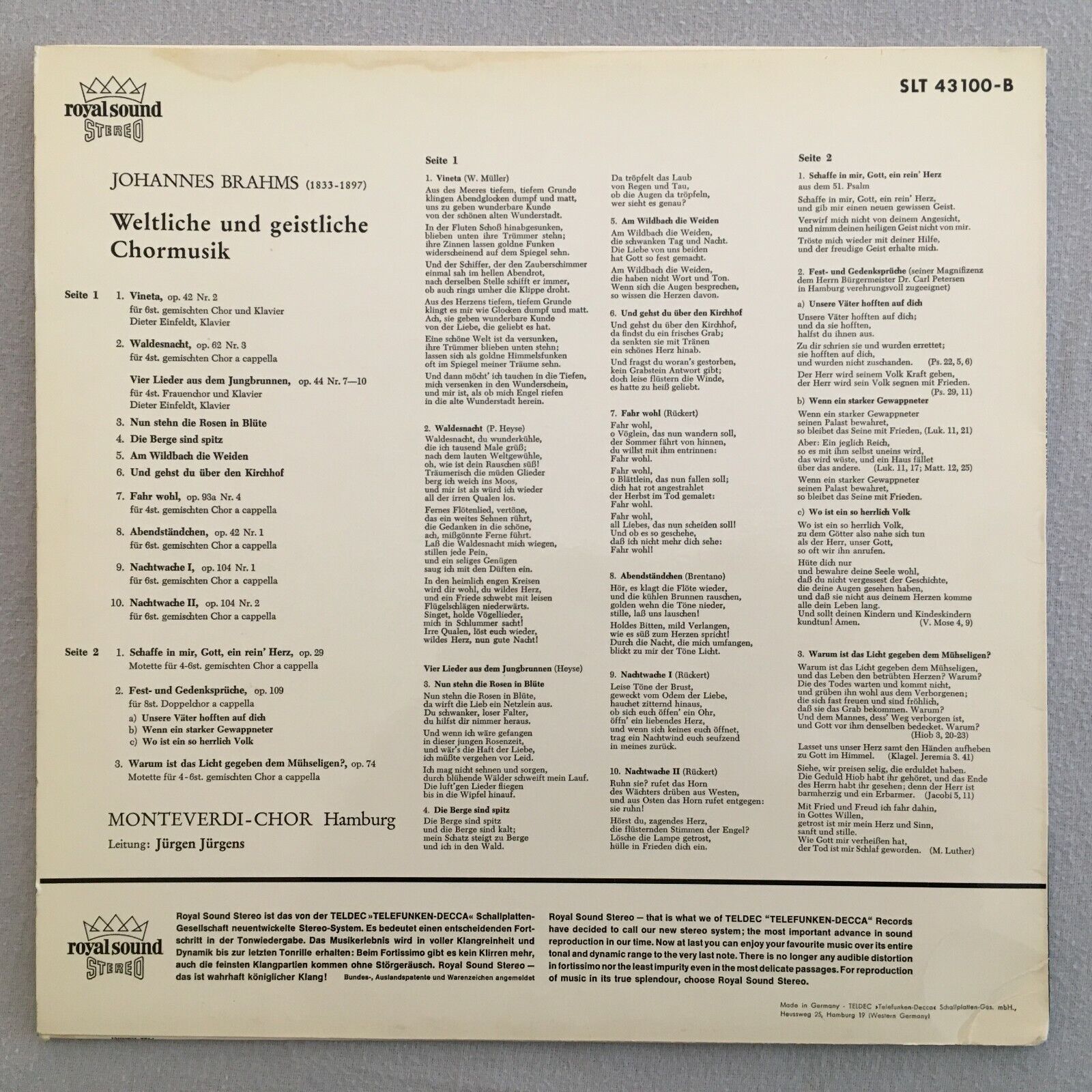 V568 Brahms Secular & Sacred Choral Music Jürgens Telefunken SLT 43 100-B Stereo