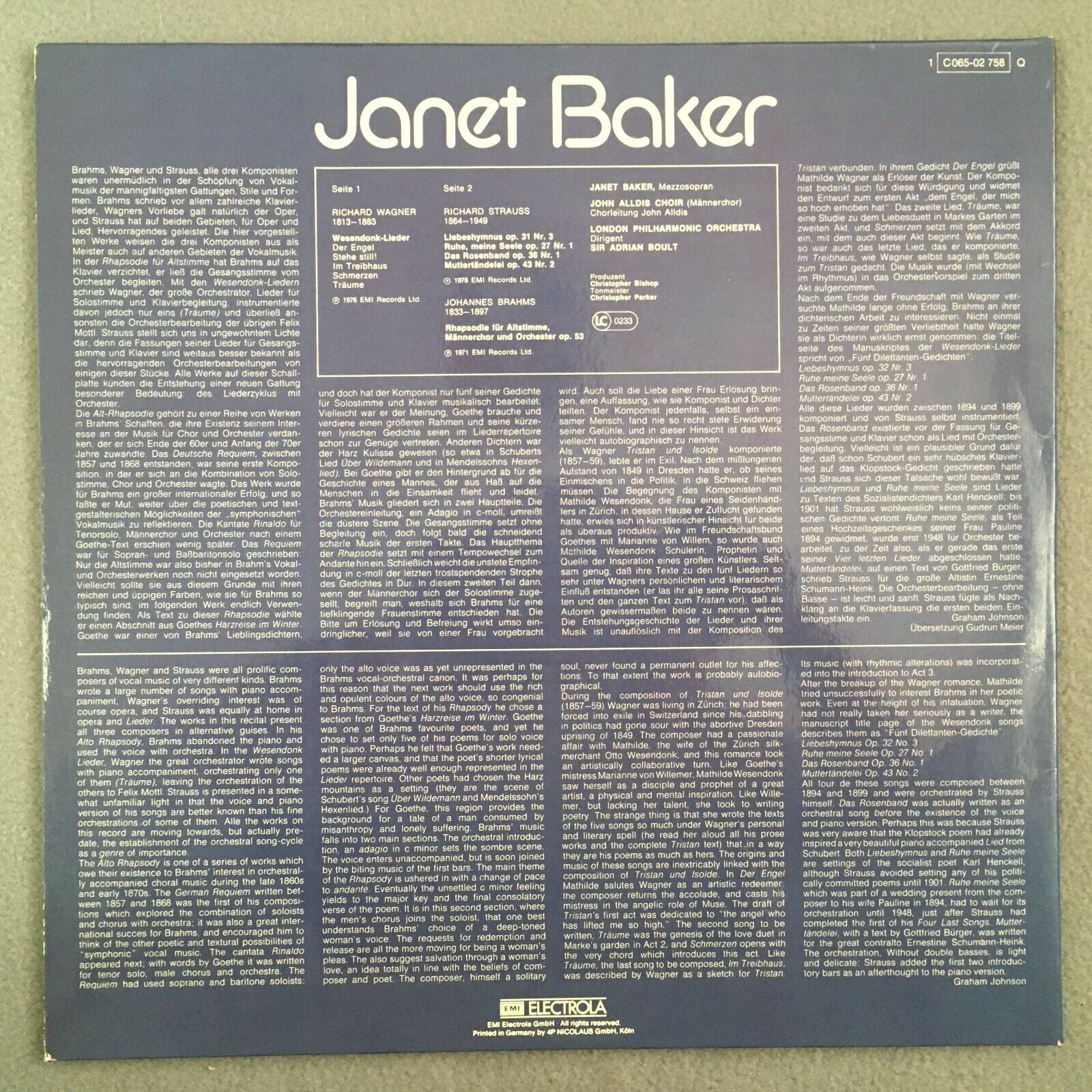 Z555 Janet Baker Songs Brahms Wagner Strauss Boult EMI 1 C 065-02 758 Q Quadro