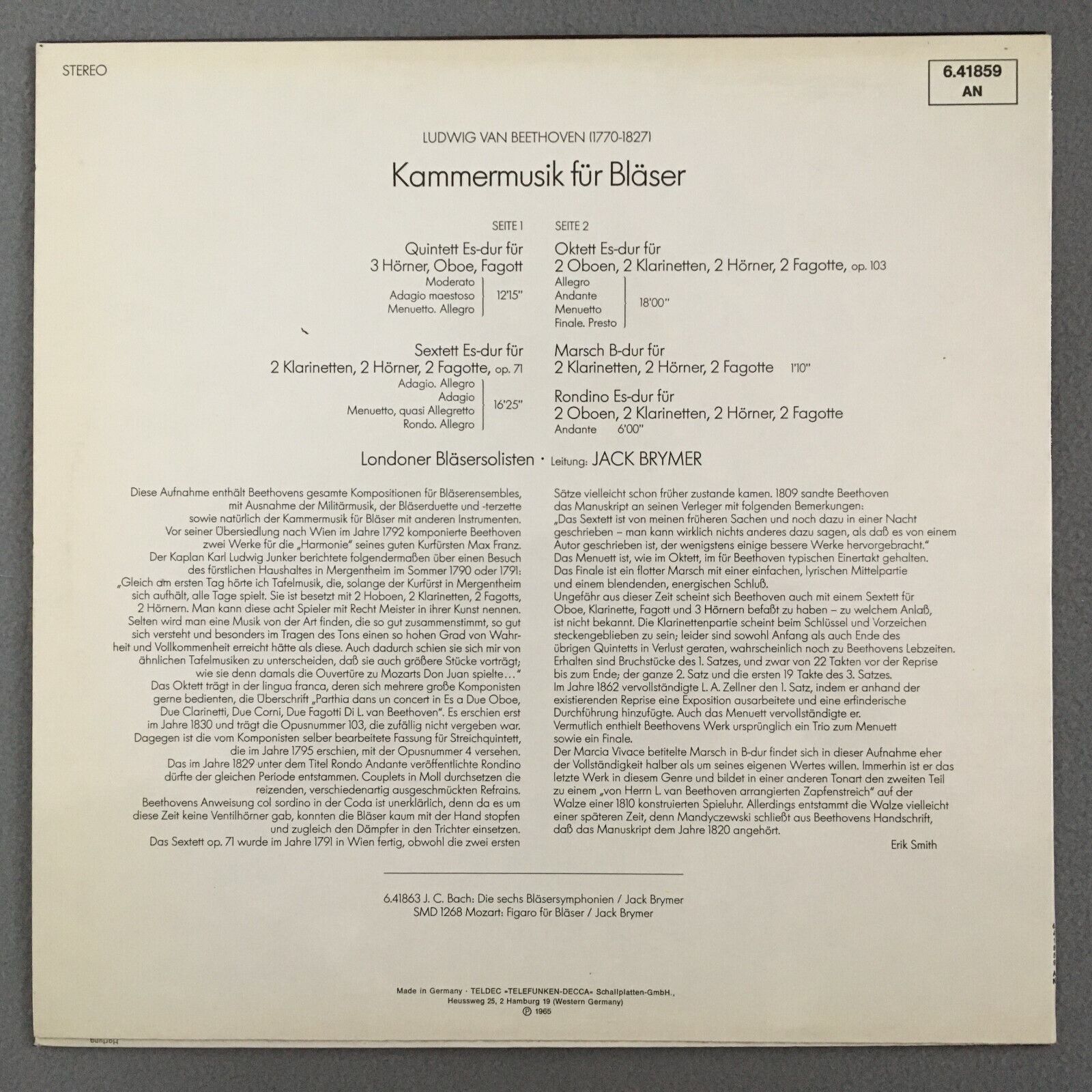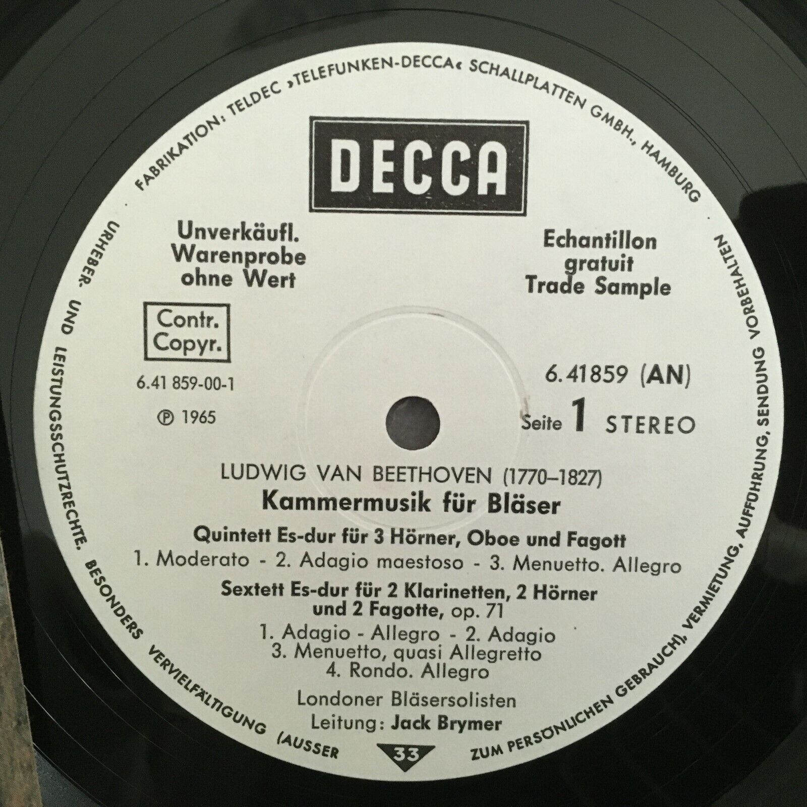 Z659 Beethoven Chamber Music For Wind Instruments Brymer DECCA 6.41859 AN Stereo