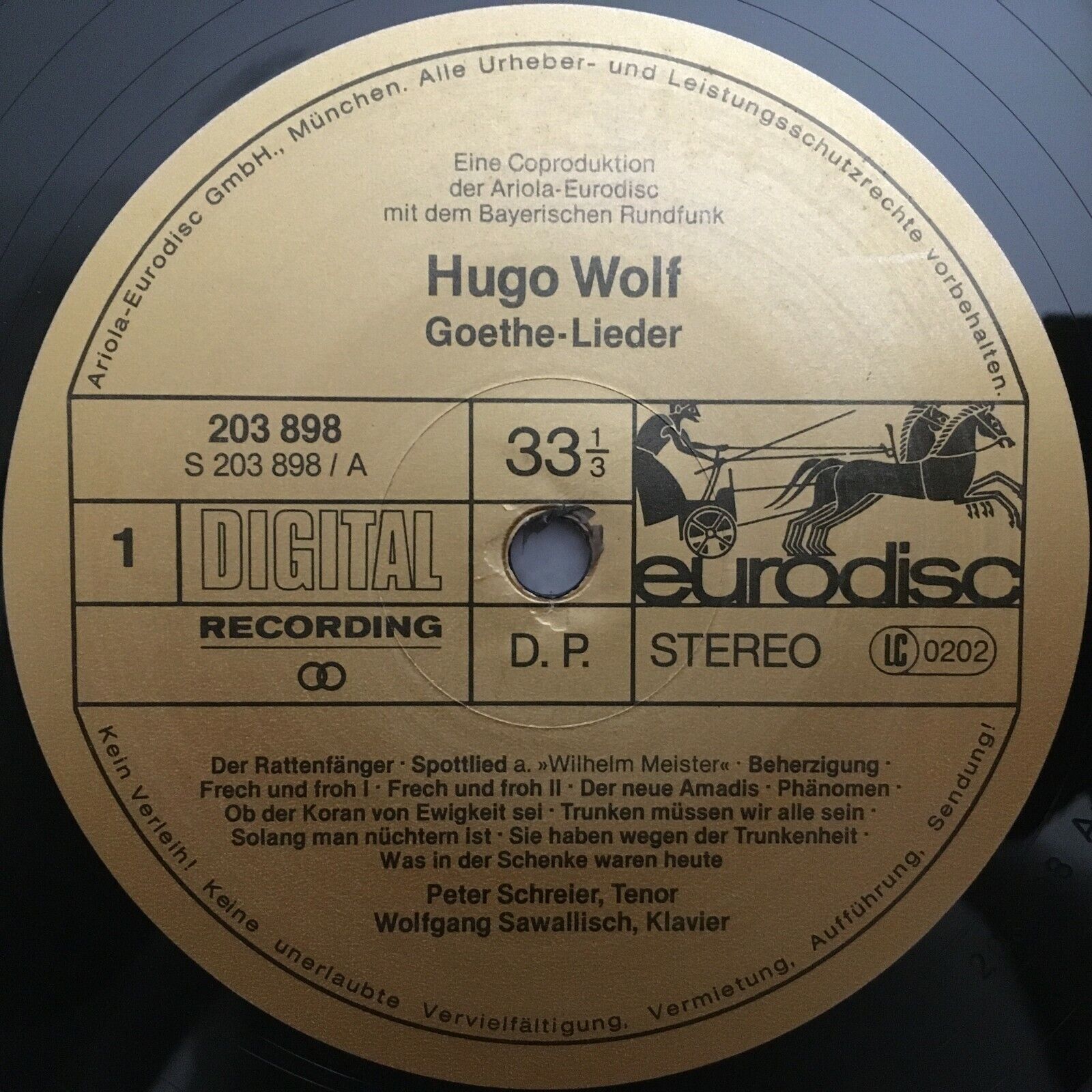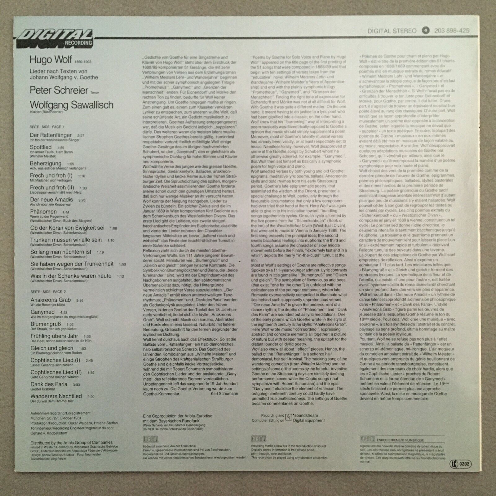 V086 Wolf Goethe Songs Schreier Sawallisch Eurodisc 203 898-425 Digital Stereo
