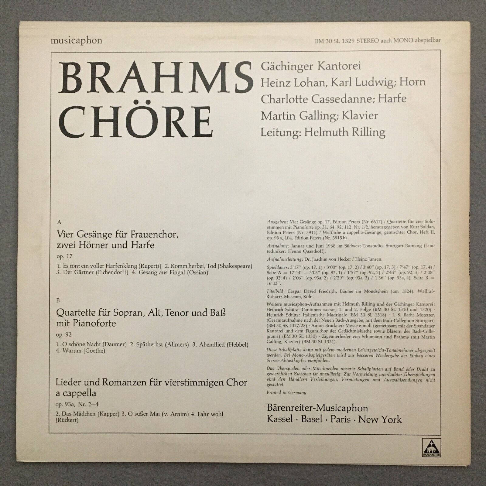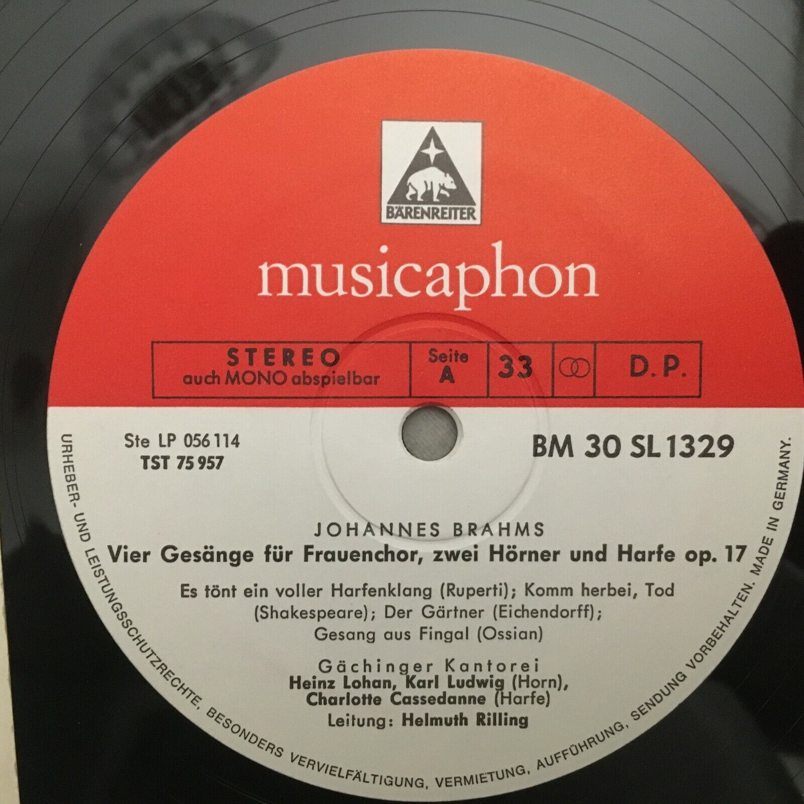 V102 Brahms Choirs Galling Lohan Ludwig Rilling Musicaphon BM 30 SL 1329 Stereo