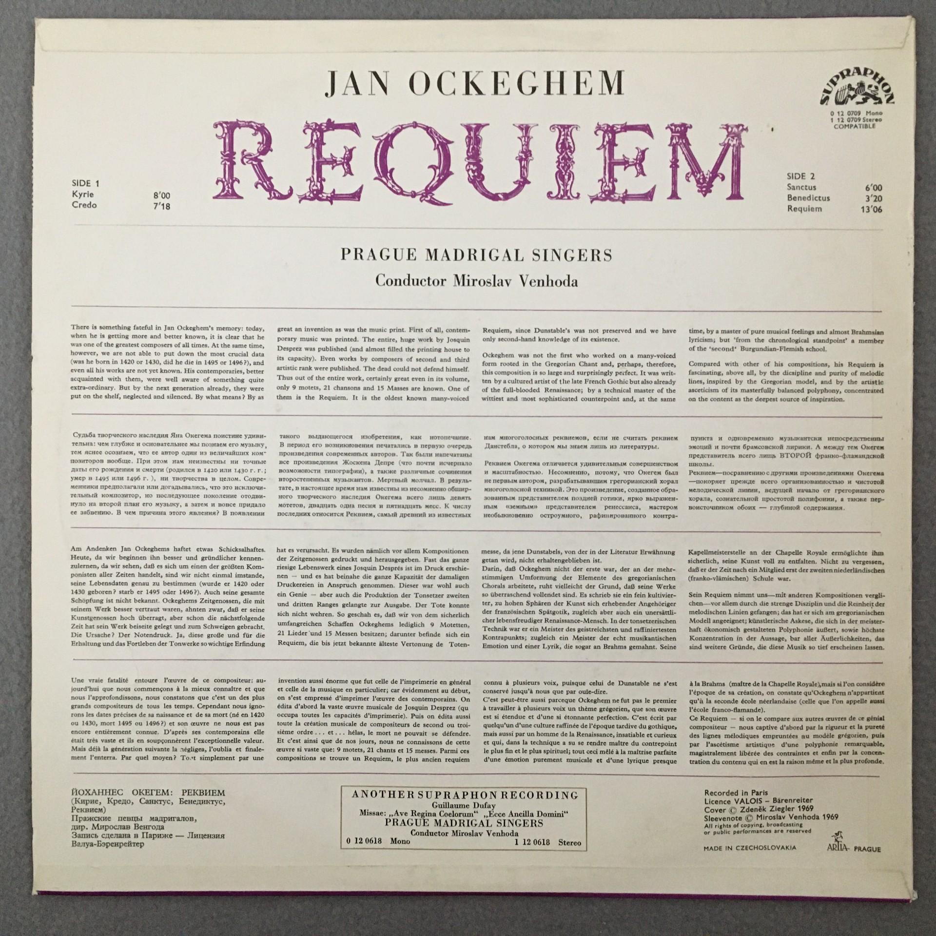 L874 Ockeghem Requiem Venhoda Supraphon 0 12 0709 Stereo ED1