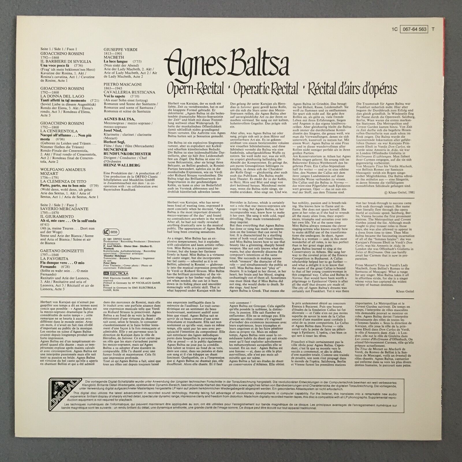 Z695 Baltsa Operatic Recital Mozart Verdi EMI 1C 067-64 563 T Digital Stereo