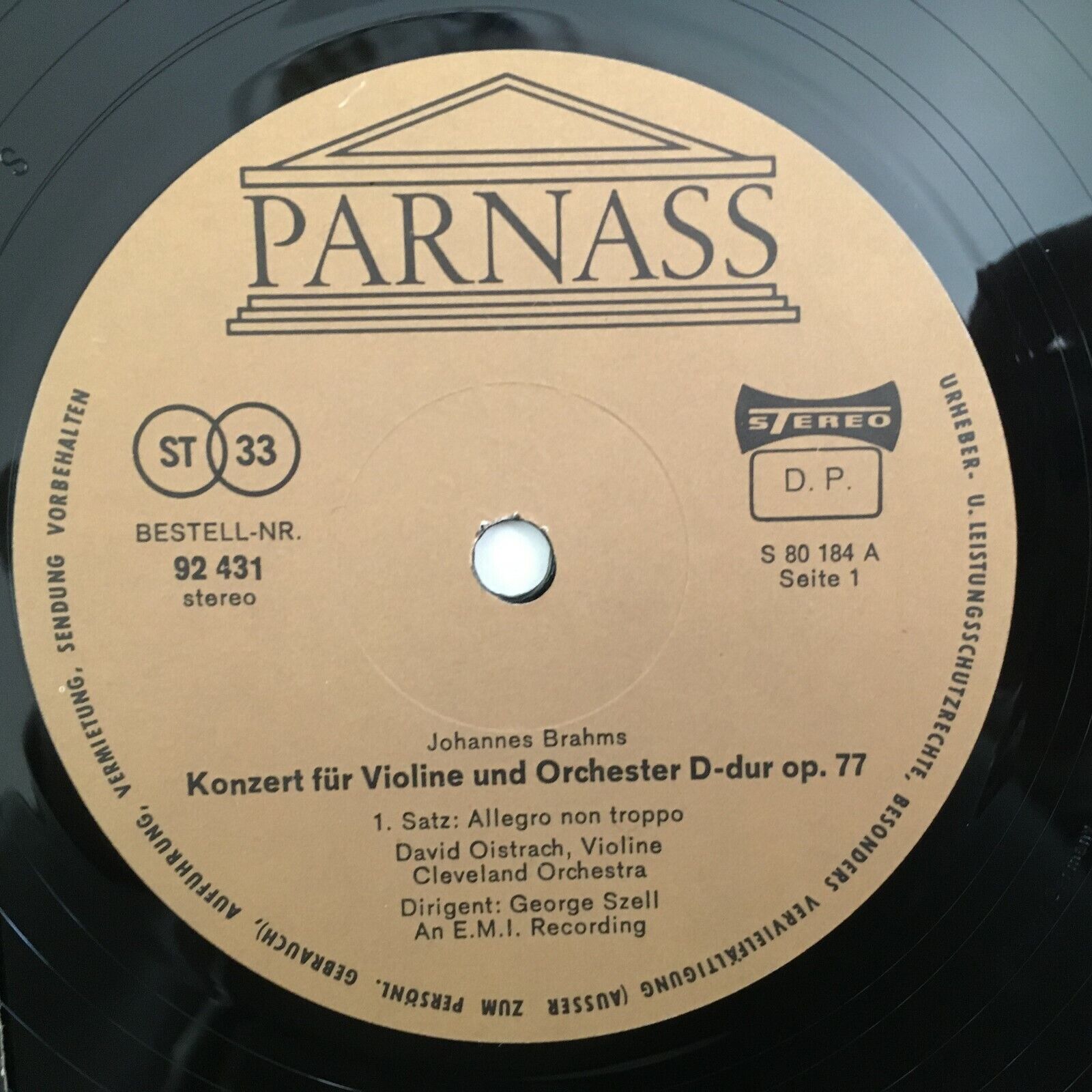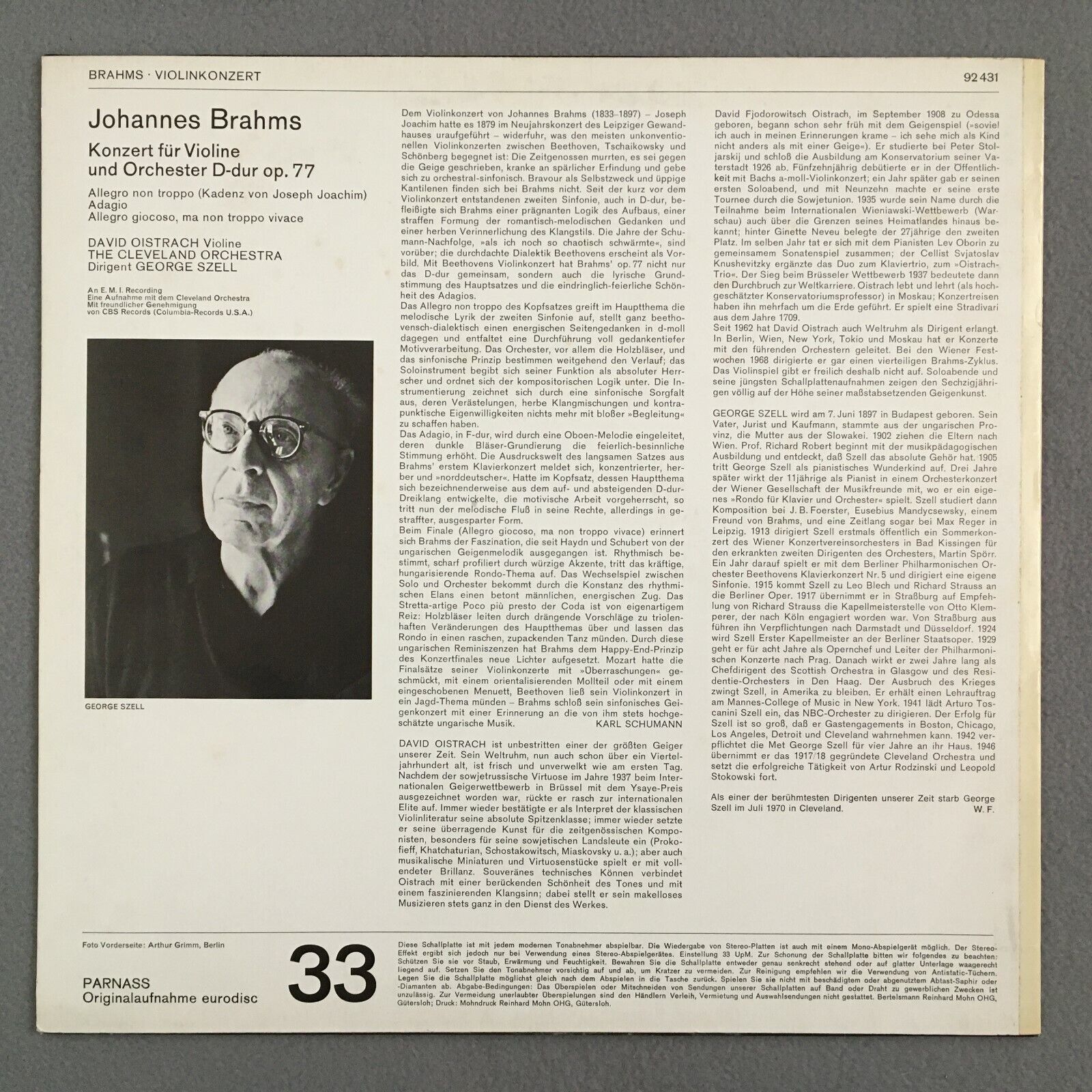 Z525 Brahms Violin Concerto Oistrakh Szell Parnass 92 431 Stereo