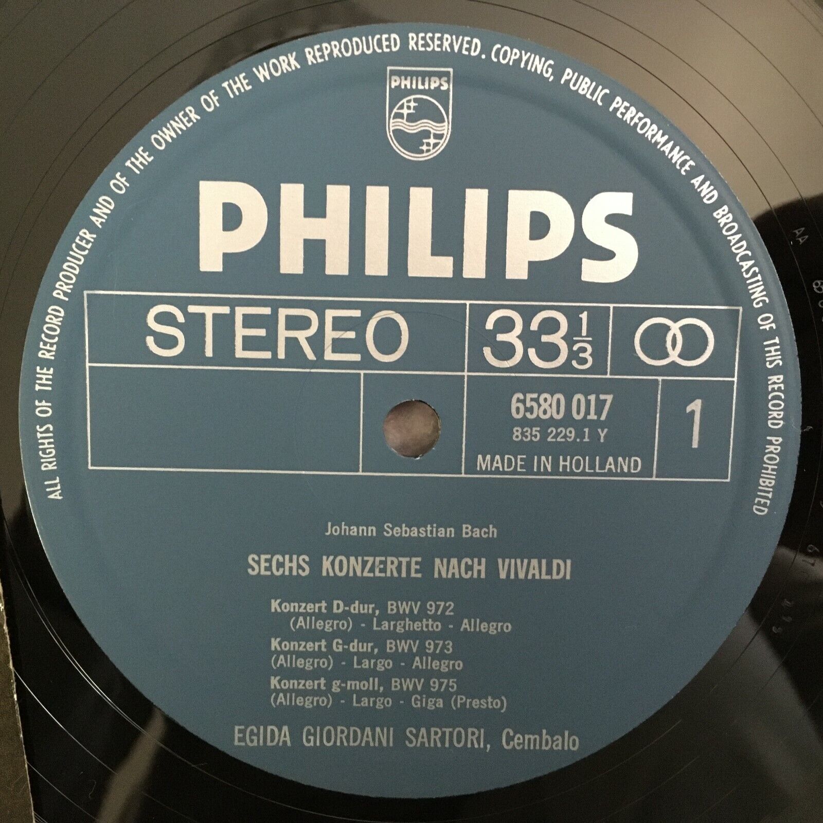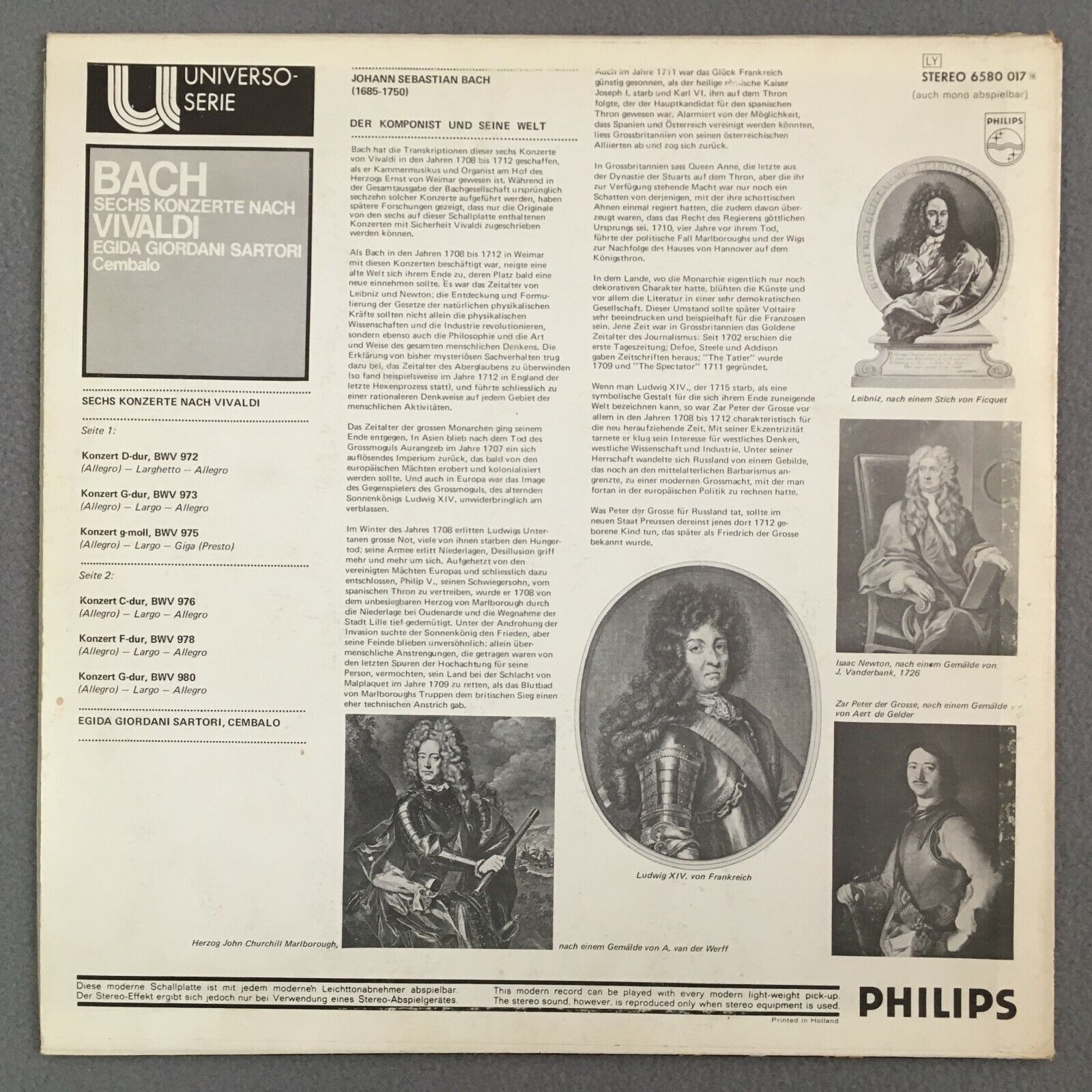 Z388 Bach 6 Concertos according to Vivaldi Sartori Philips 6580 017 Stereo
