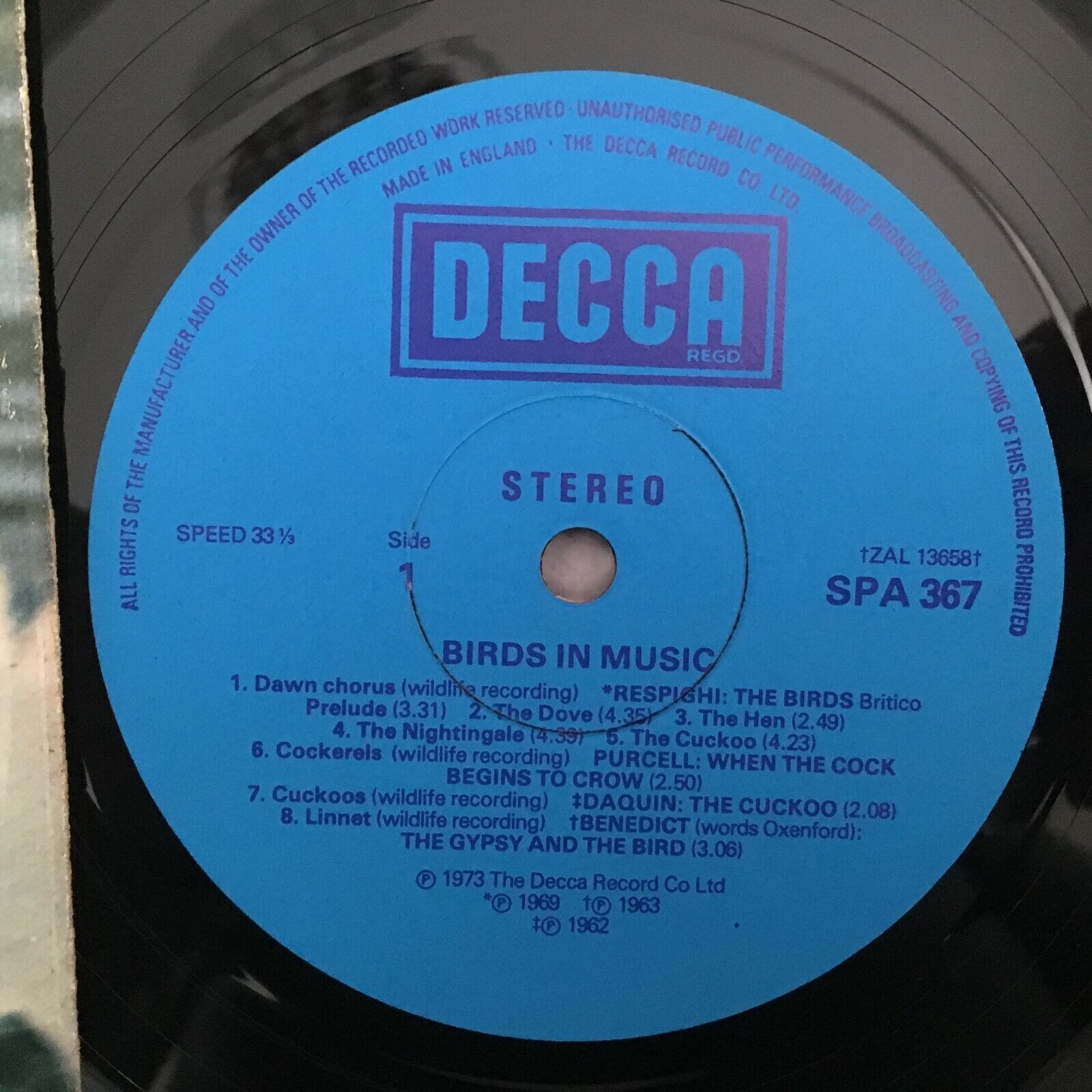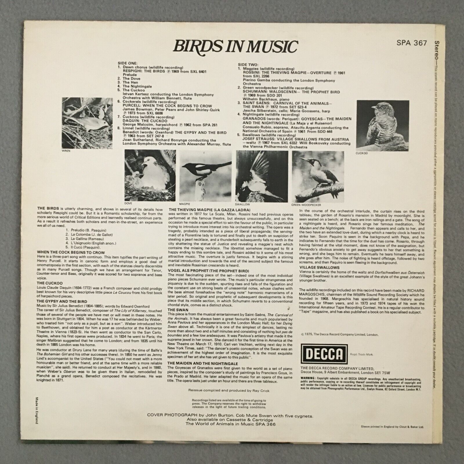 P443 Birds in Music Respighi Purcell Rossini Saint-Saens DECCA SPA 367 Stereo