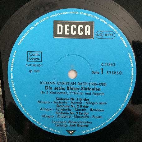 P468 J.C. Bach Symphonies Brymer Moore Harper Waller DECCA 6.41863 AN Stereo